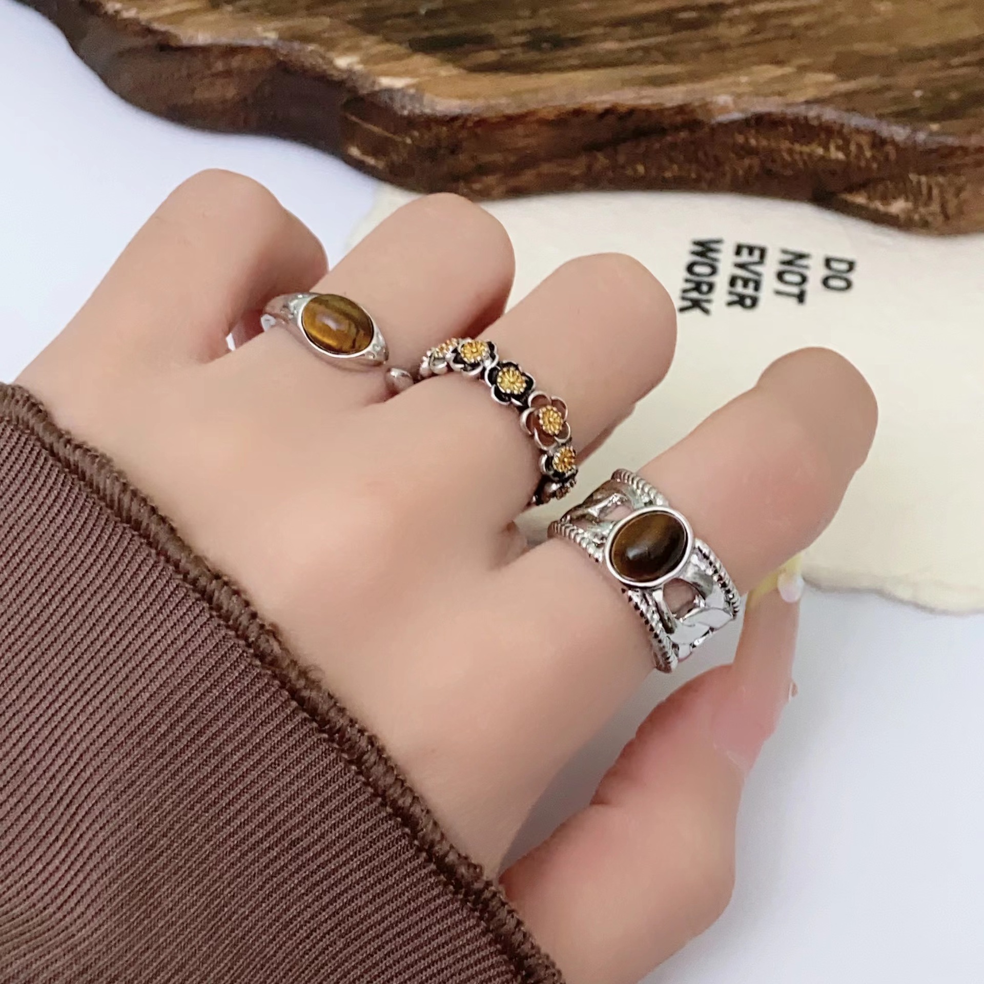 美ラードのレトロな金色の太陽の花の虎の目の石の指輪の新型の高級感の指輪の小さい大衆の設計の独特な手飾り