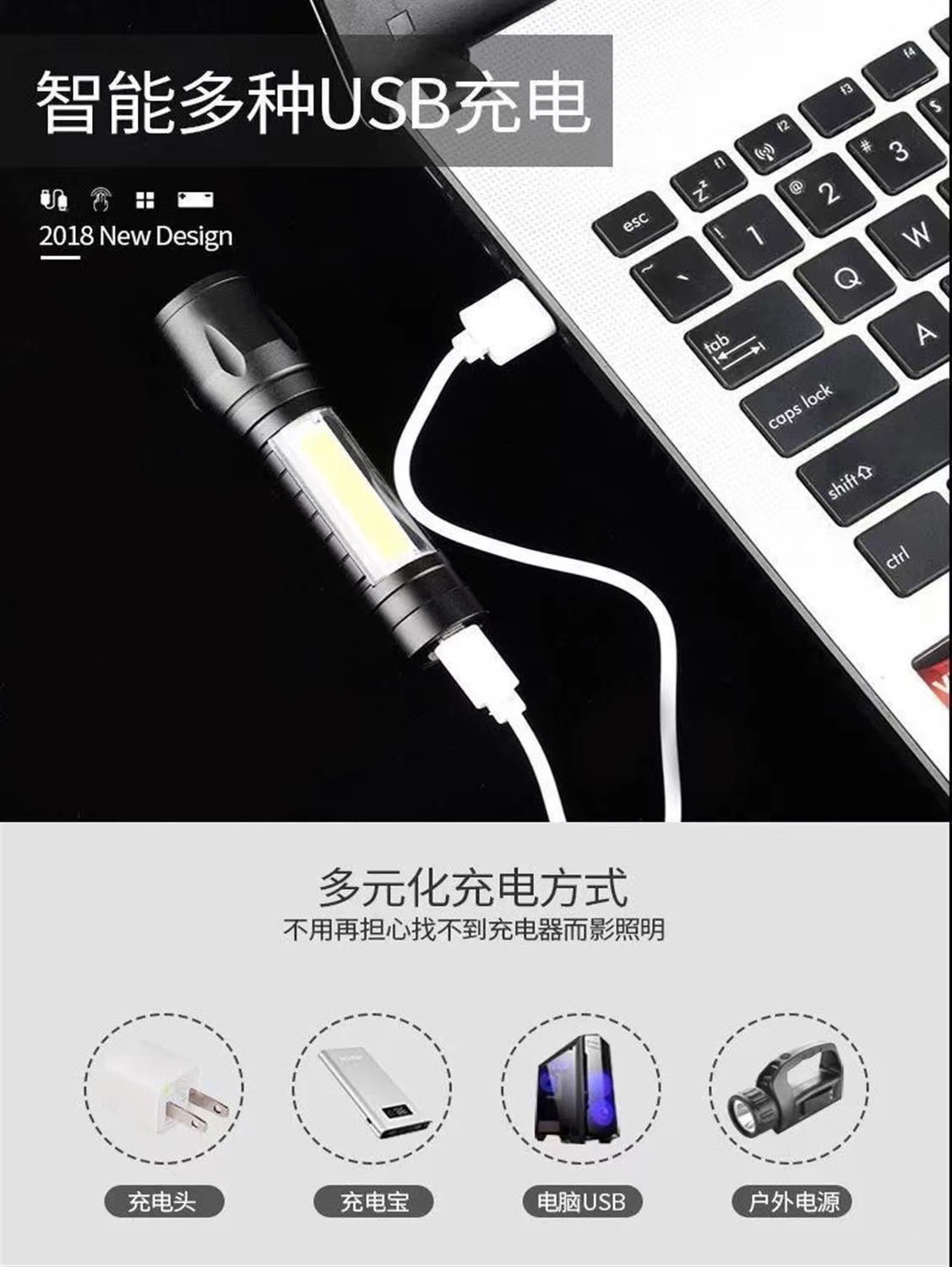 クロスボーダーミニLED懐中電灯 USB充電式 アウトドア防水 伸縮ズーム アルミ合金 COB 小型充電式