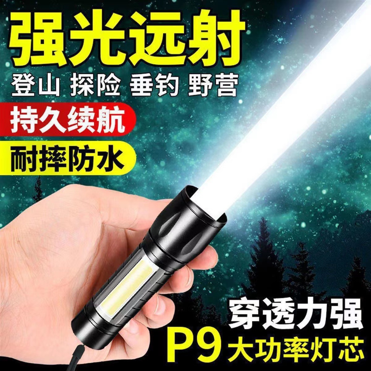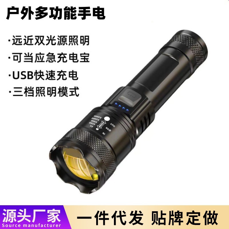 人気のクロスボーダー屋外強力な光懐中電灯ズーム伸縮式多機能ポータブル充電式長距離超高輝度雷懐中電灯