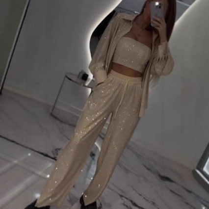 2025欧美新款爆款亮片吊带休闲西装外套宽松长裤三件套