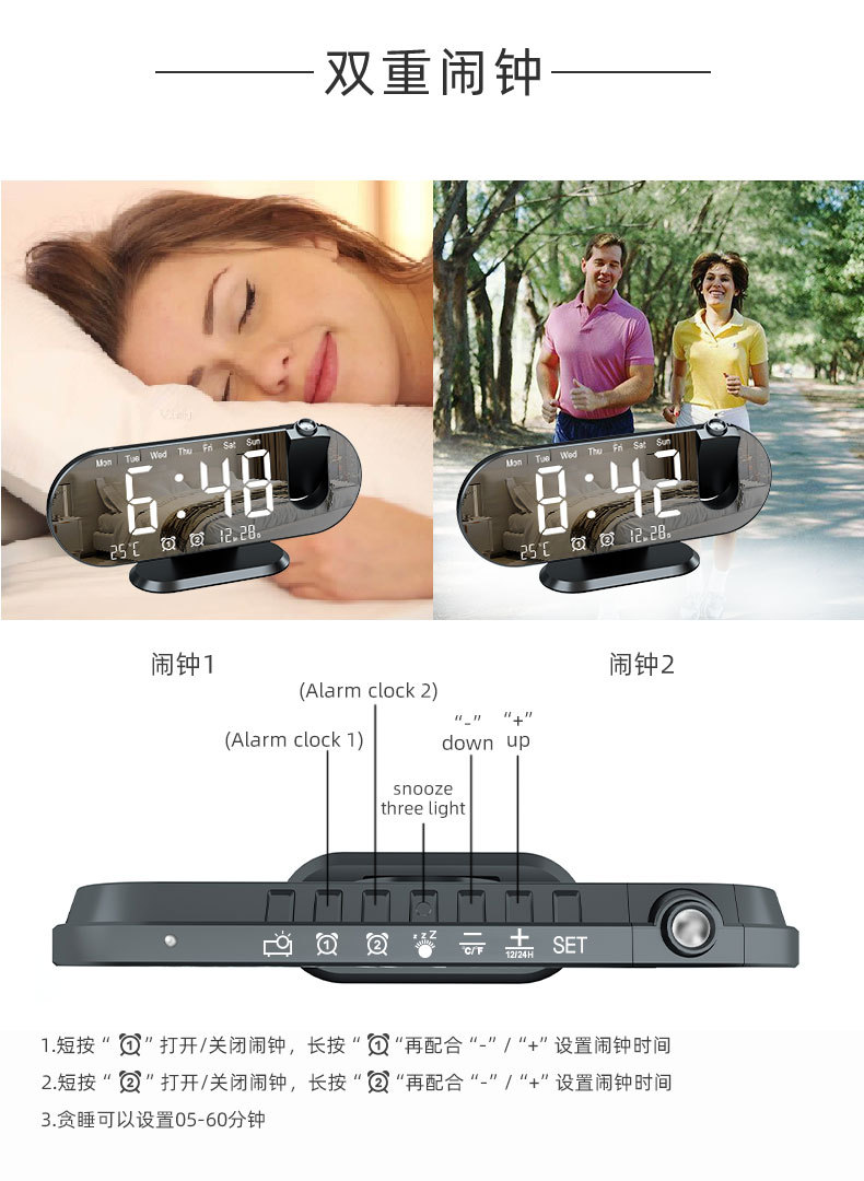 卸売りクロスボーダーダブル投影目覚まし時計投入時間投温度大画面デジタル電子時計LED鏡面夜光時計