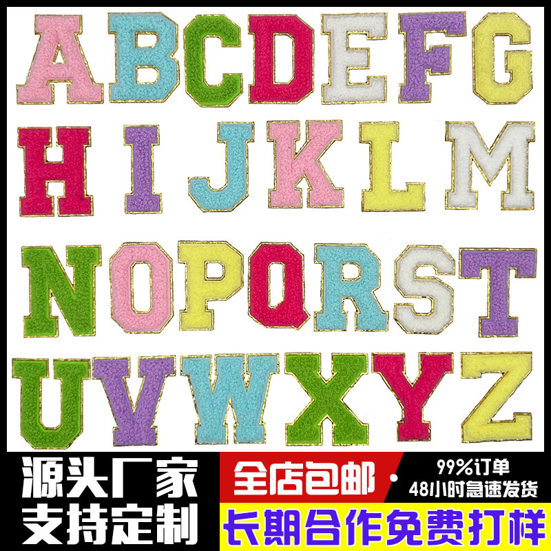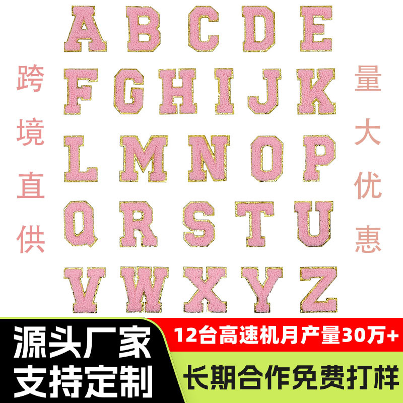 布贴批发毛巾绣字母布贴跨境专供格丽特金边雪尼尔辅料刺绣补丁贴