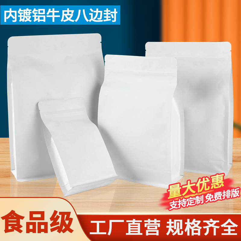 現物白色クラフト紙アルミメッキ八辺封自立自封袋カスタムクラフト紙袋厚手茶葉包装袋