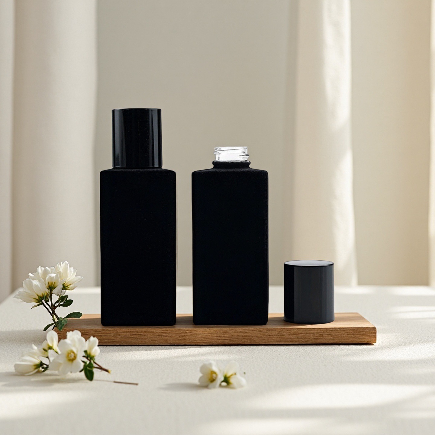 現品50ml香水瓶黒磁気鉄蓋偏平な厚い底のスプレーの瓶の化粧品の包装の瓶のガラスの空の瓶