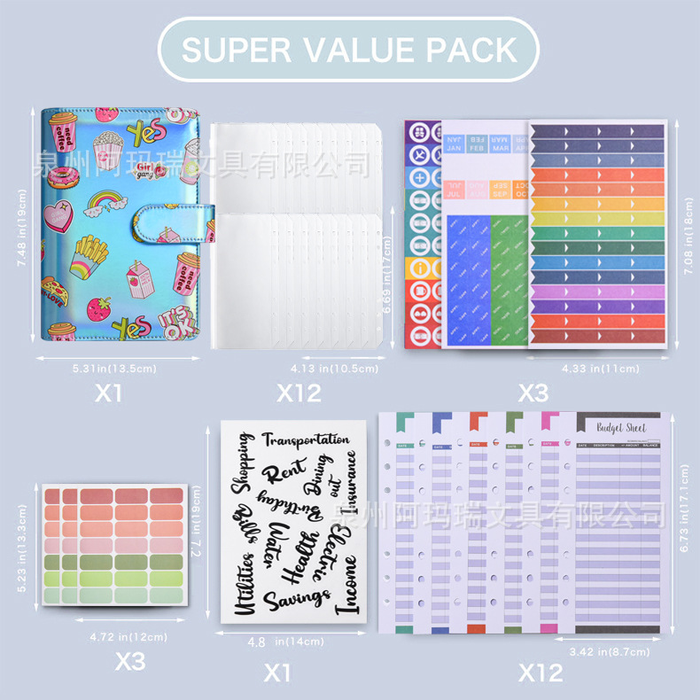 表紙の色 紫 (シングルシェル),ピンク (シングルシェル),ブルー (シングルケース),シルバー (シングルケース),イエロー (シングルケース),黒 (シングルシェル),紫 (12枚の予算カード8枚のチャック袋2枚の英語シール3合1付箋),ピンク (12枚の予算カード8枚のジッパー袋2枚の英語シール3枚の付箋),青 (12枚の予算カード8枚のジッパー袋2枚の英語シール3枚の付箋),シルバー (12枚の予算カード8枚のジッパー袋2枚の英語シール3枚の付箋),黄色(12枚の予算カード8枚のジッパー袋2枚の英語シール3枚の付箋),ブラック (12枚の予算カード8枚のジッパーバッグ2枚の英語シール3枚の付箋)