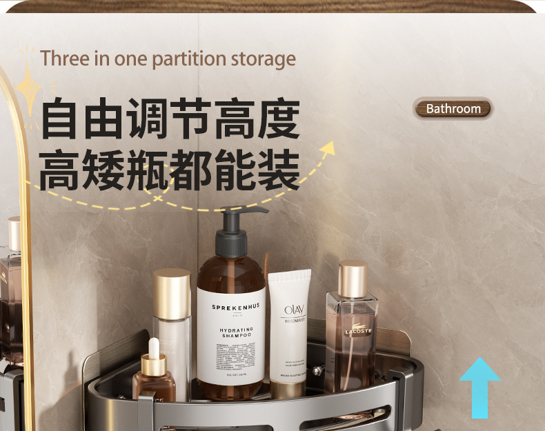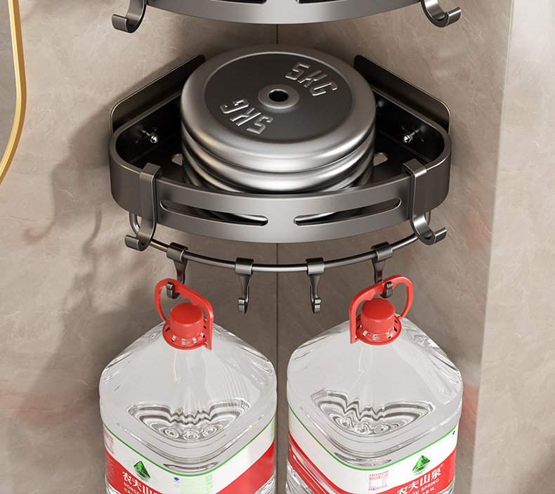 銃の灰色のトイレの物置棚の三角の壁掛け式の浴室は穴を開けないで角を回転して手を洗って風呂のトイレを洗って収納します。