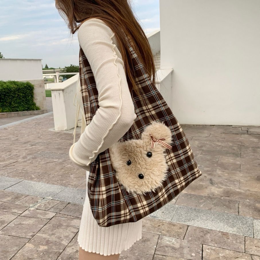 秋冬时尚毛绒卡通小熊格子背心包学生大容量帆布袋少女休闲单肩包