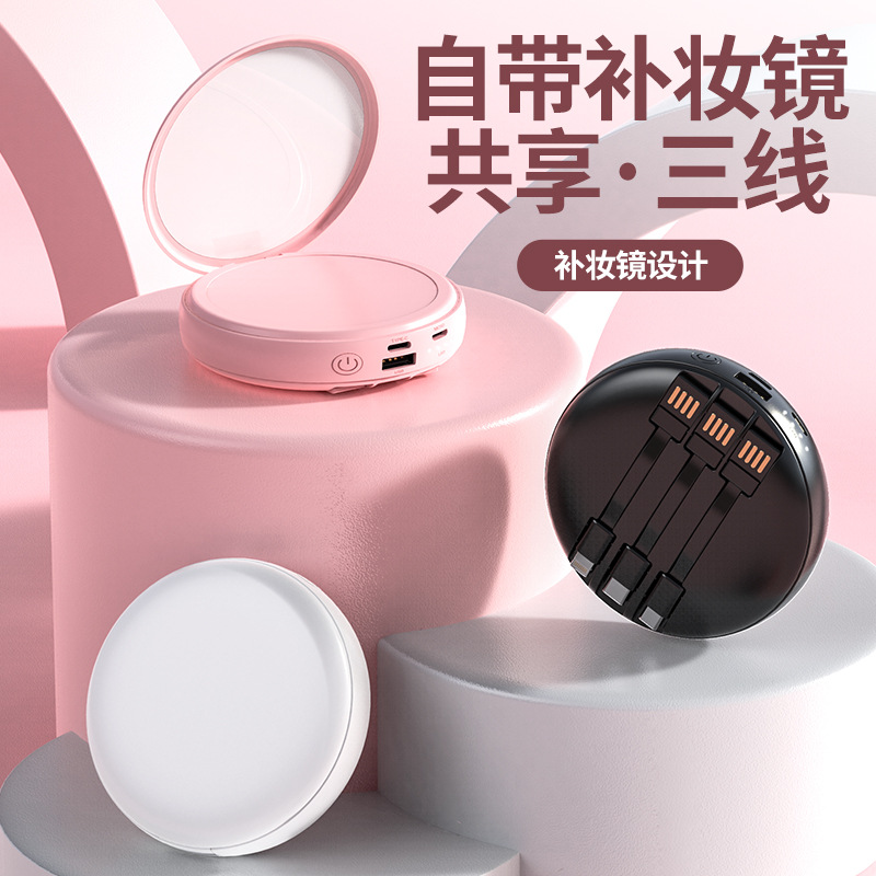 ミニでコンパクト、持ち運びに便利、内蔵の3線式充電器付き、化粧鏡付き丸型20000mAh大容量モバイルバッテリー