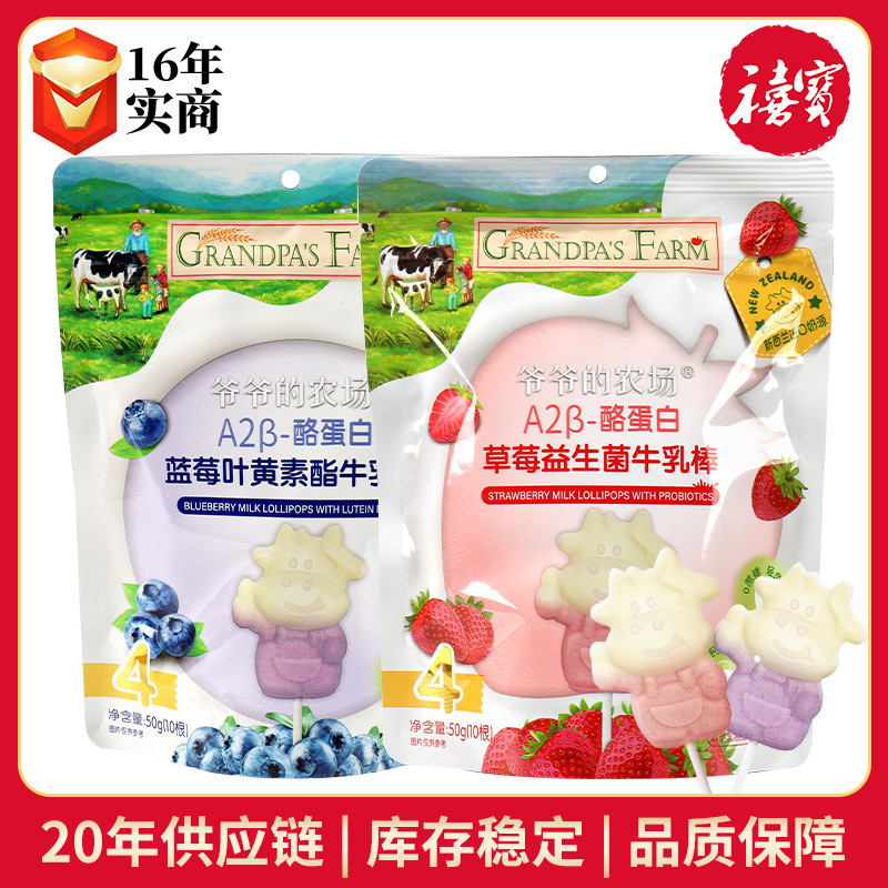 おじいちゃんファームA2β カゼイン牛乳スティック50gイチゴプロバイオティクスブルーベリー叶黄素エステルミルクロリポップ