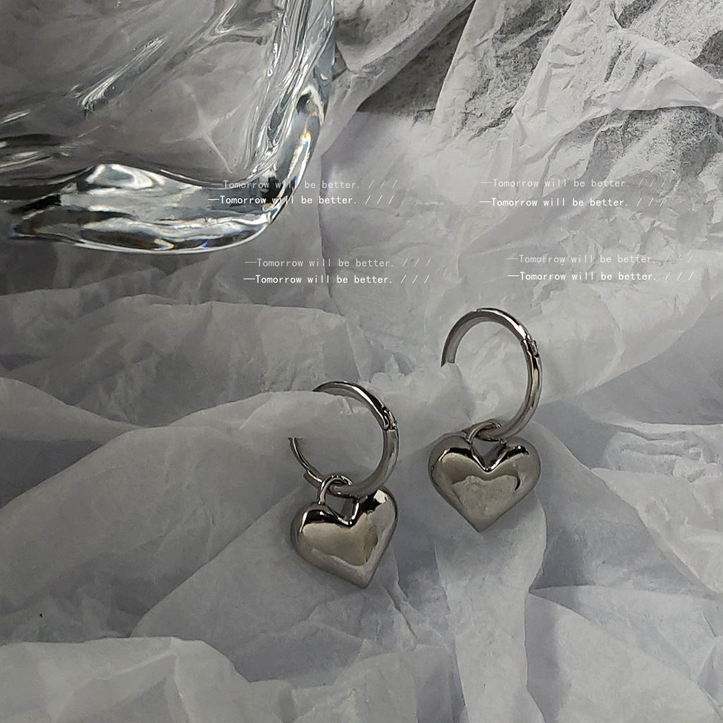 冷淡风シルバーハート耳ボタン日韩デザイン感立体光沢金属感ハート型イヤリング高级感耳饰り