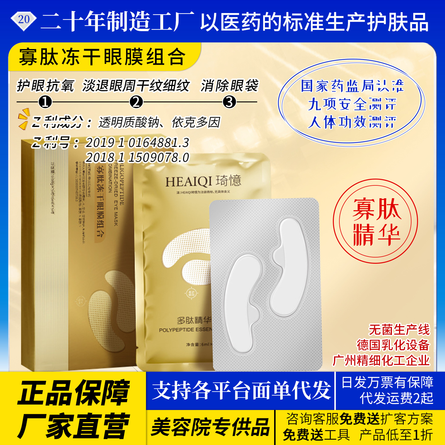 奇藝オリゴペプチドコラーゲン引き締めアンチエイジング、小じわ・クマ改善アイマスク、引き締め・シワ軽減フリーズドライアイマスク