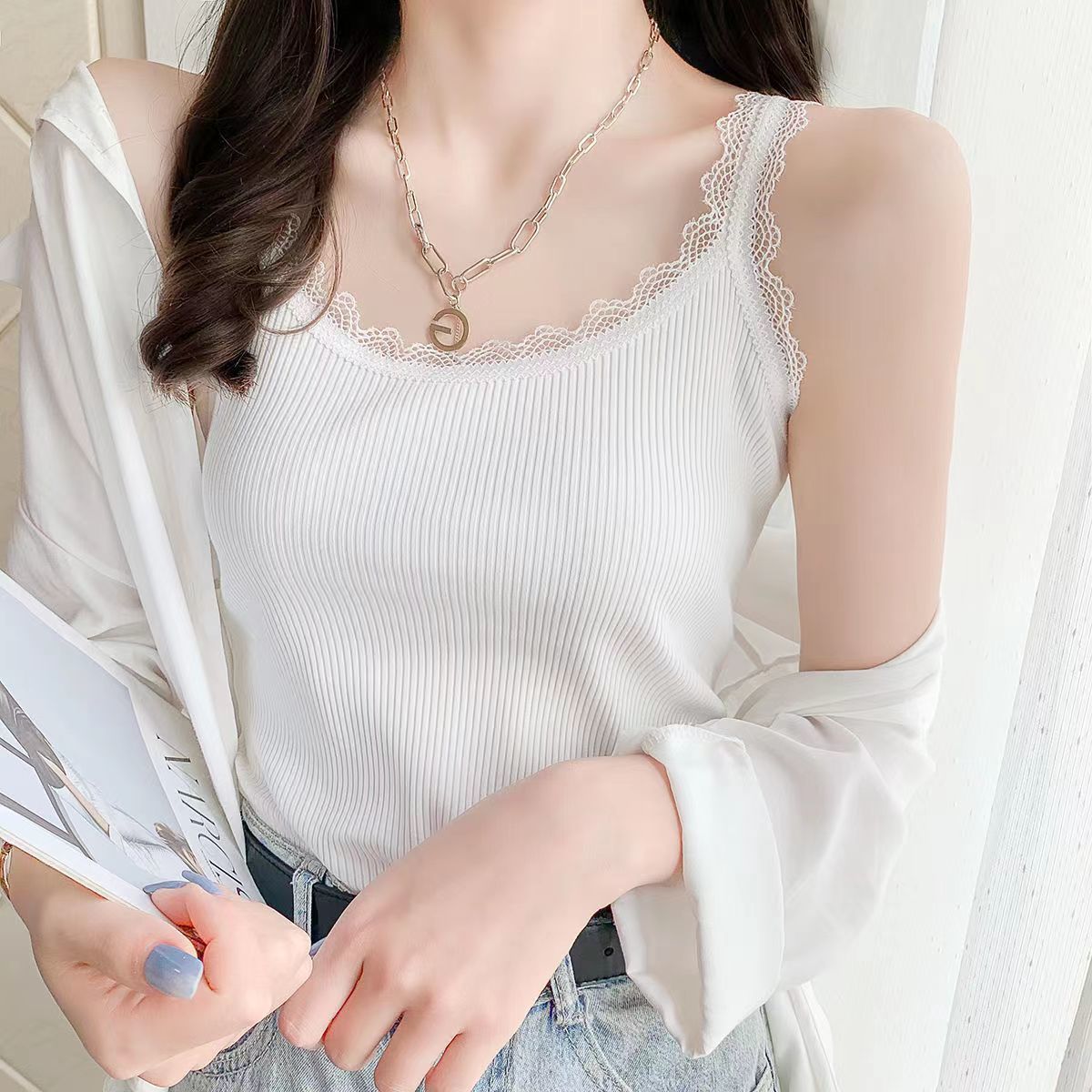 モーデル綿夏の新型婦人服レースのネジの外着に涼しくて快適なキャミソールを着て上着を着ます。