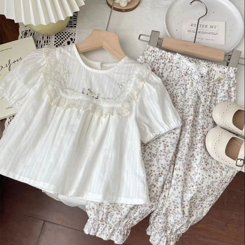 女の子の夏のホーム服セットベビーファッショナブルな子供の個性トレンディな韓国スタイルの菌エッジ花柄空調服パジャマ