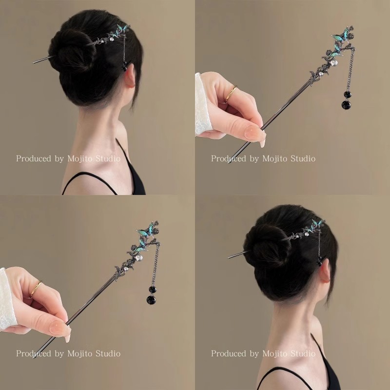 双蝶流蘇ヘアピン女性高級感国風ヘアピン後頭部古風新中国式チャイナドレスヘアピン