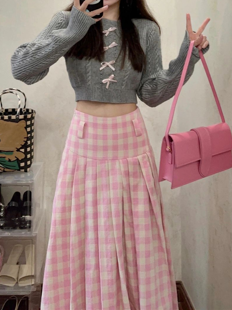 大きいサイズの太ったmmの夏の新型の甘い風のピンクの格子の半身のスカートの女性の腰の百合a字のスカートの長いスカート