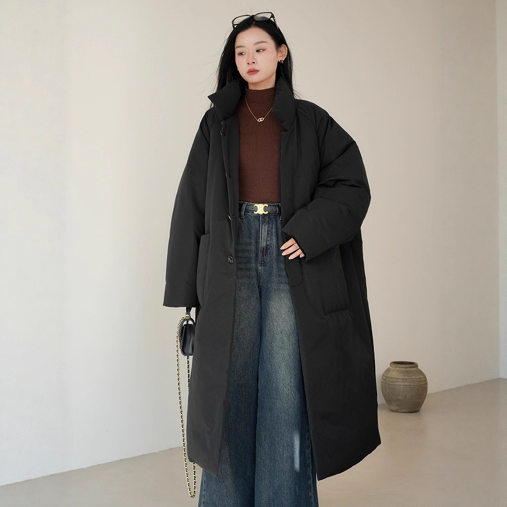 2025年冬 カップル向け 厚手 ロングダウンコットンジャケット 男女兼用 スタンドカラー フード付き 暖かい ゆったりコート