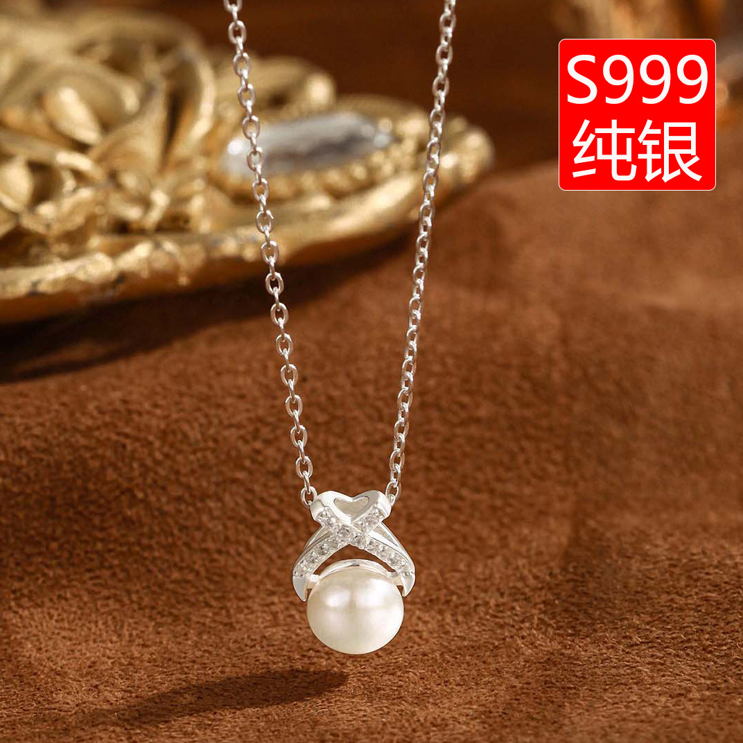 S999純銀足銀はダイヤモンドを入れて天然真珠のネックレスを交差します。