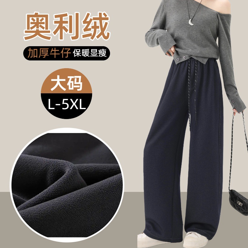 大码秋冬裤子垂感高腰休闲阔腿裤松紧腰直筒宽松加绒显瘦软牛仔裤