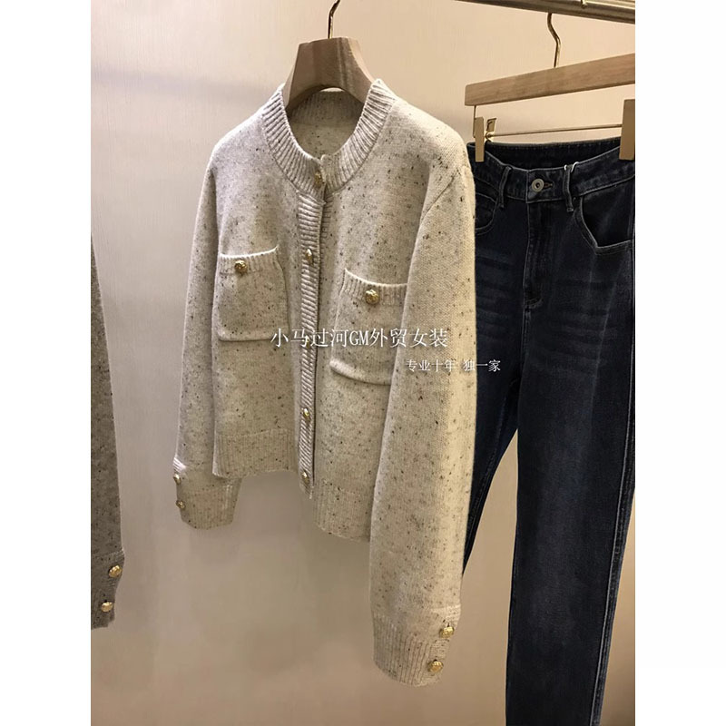 怠惰でシンプルで贅沢なお金風が長袖のニットカーディガンのコートを着ています。