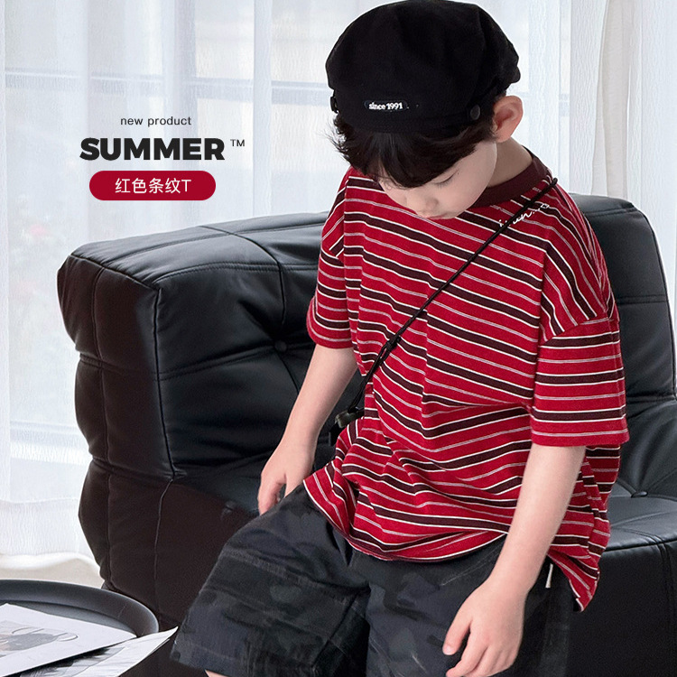 夏の韓系男の子半袖tシャツ2025新型子供純綿上着ゆったり韓範女の子半袖ストライプ