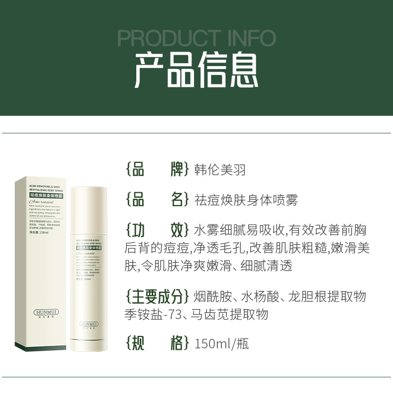 韩伦美羽祛痘焕肤身体喷雾祛后背痘痘背粒消背部祛痘喷雾抛光水
