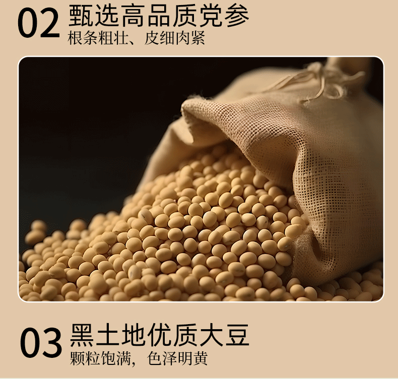 原料と原料 大豆、山薬、ナツメ、枸杞子、桂円、党参、モンゴルオウギ