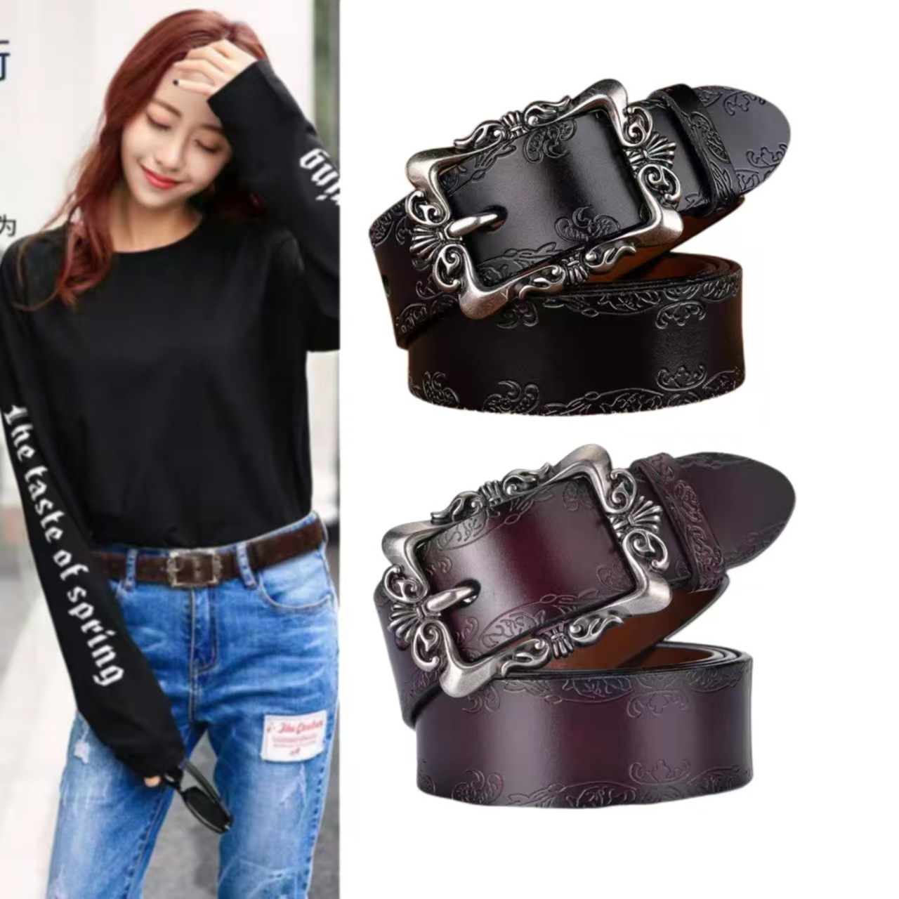 女性ベルト2023新型黒色ファッショントレンドジーンズ帯百合装飾細いベルトメーカー直販