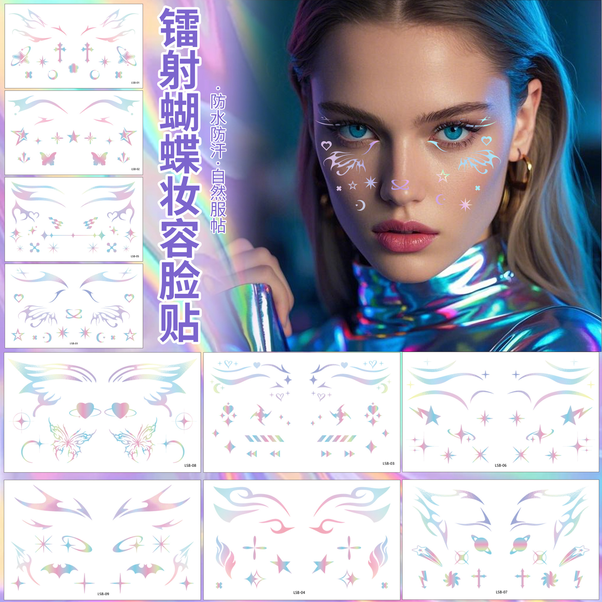 国境を越えた新型のカラフルなグラデーションの目の角に欧米の目の化粧の紋様を貼って蝶の星の化粧の刺青のシールを貼ります。