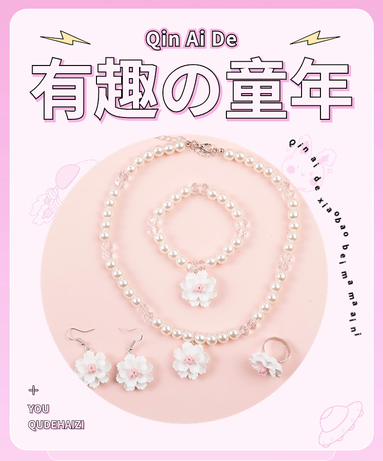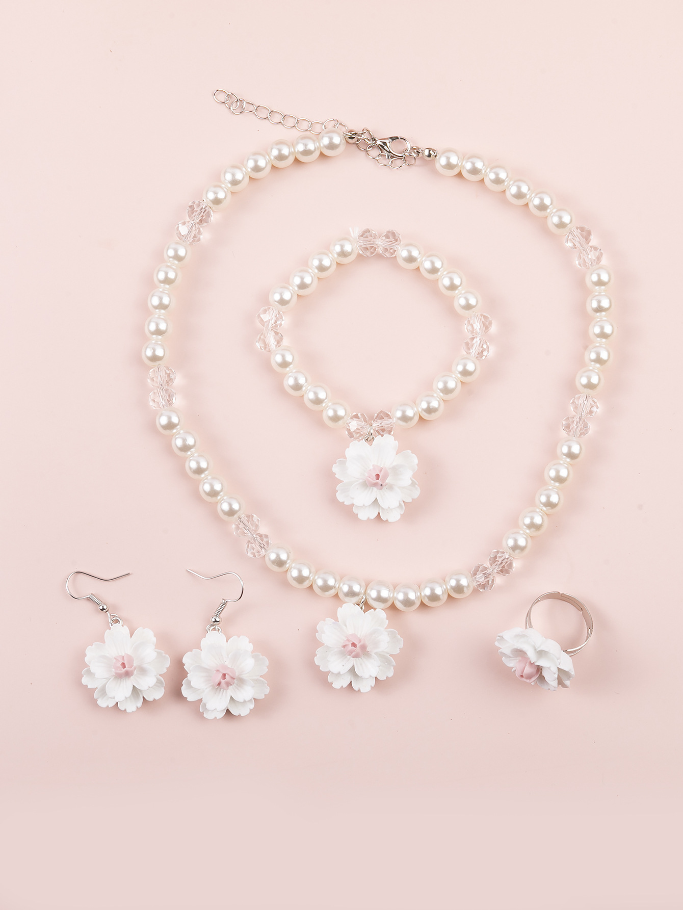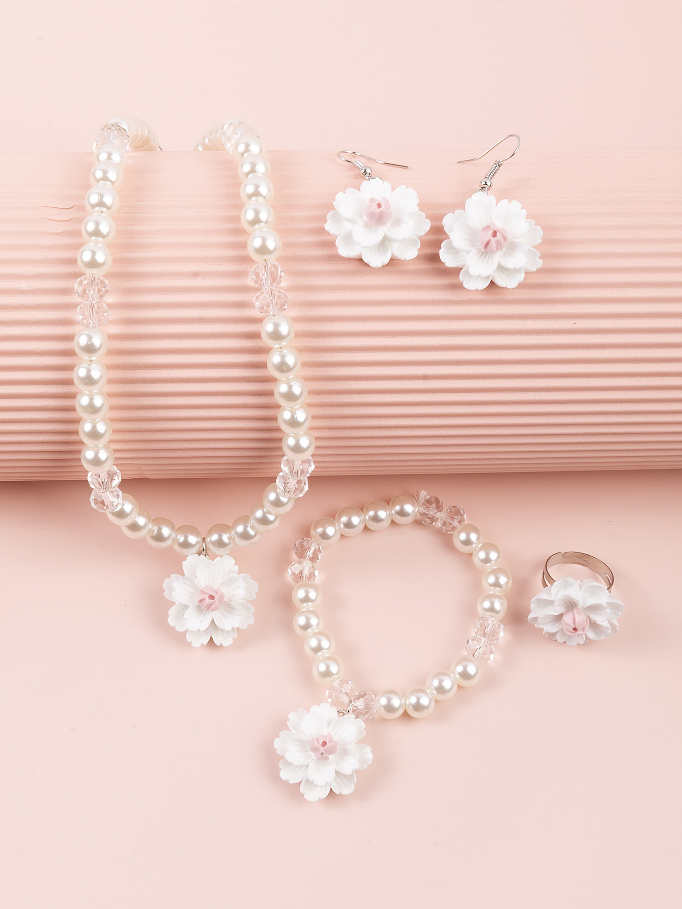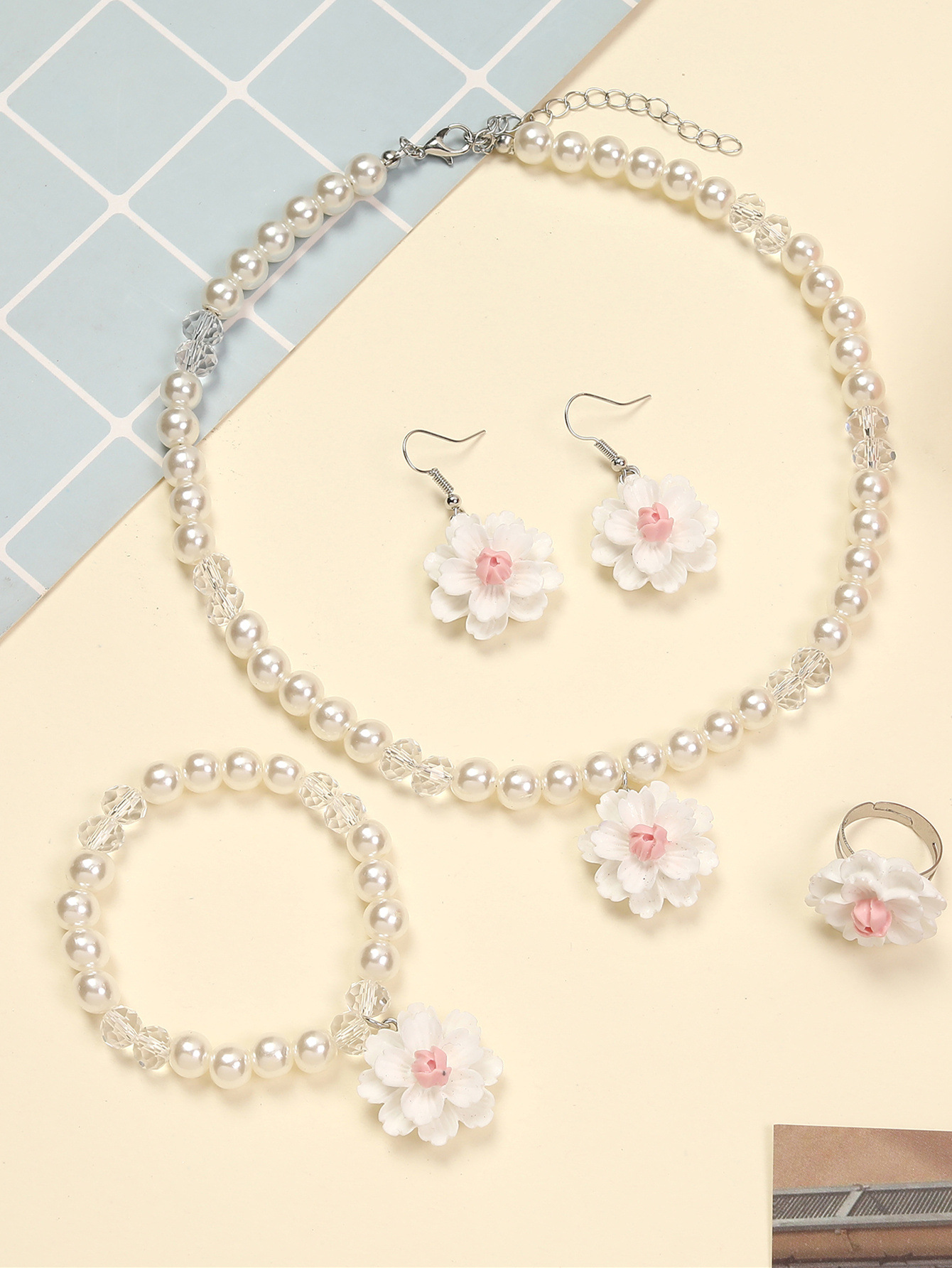 白レジン手作りビーズ花々可爱い子供ネックレスイヤリングリング3点セット