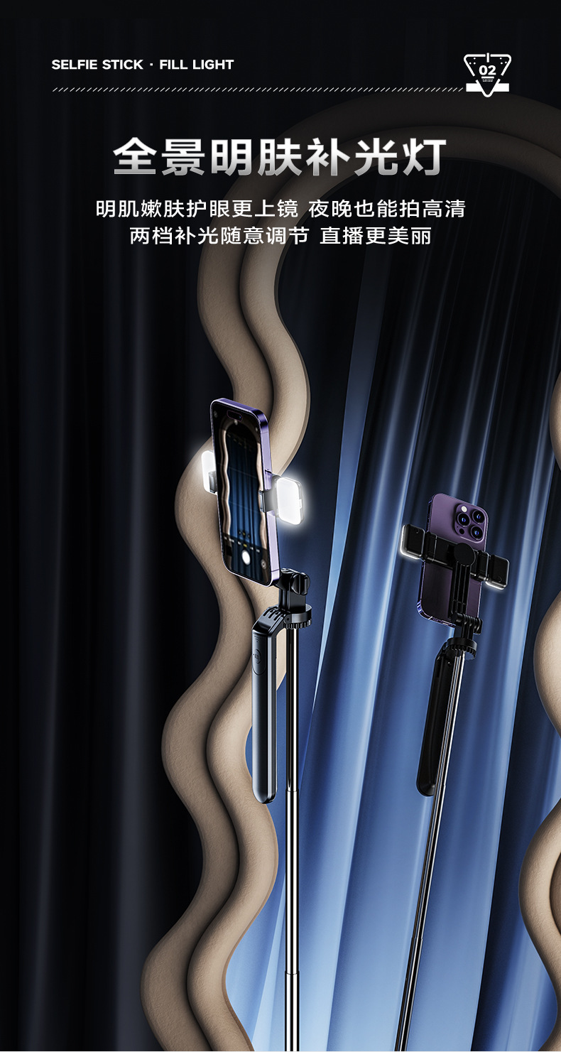 延長型スマホ自撮り棒 美顔ライト付き ミニ回転スタンド Bluetoothスマート撮影三脚自撮り棒