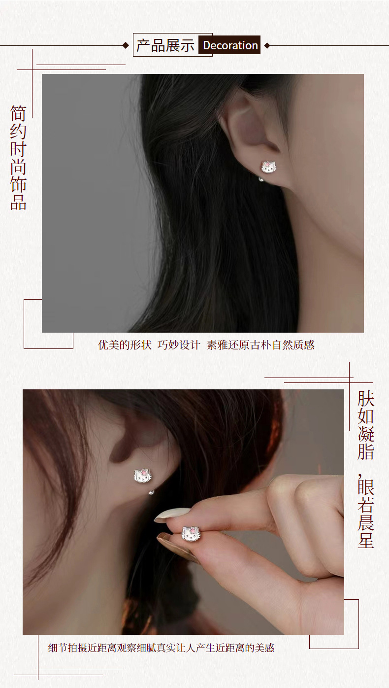 999银磨砂凯蒂猫耳钉女轻奢高级感耳环可爱甜美猫咪滴胶耳环饰品