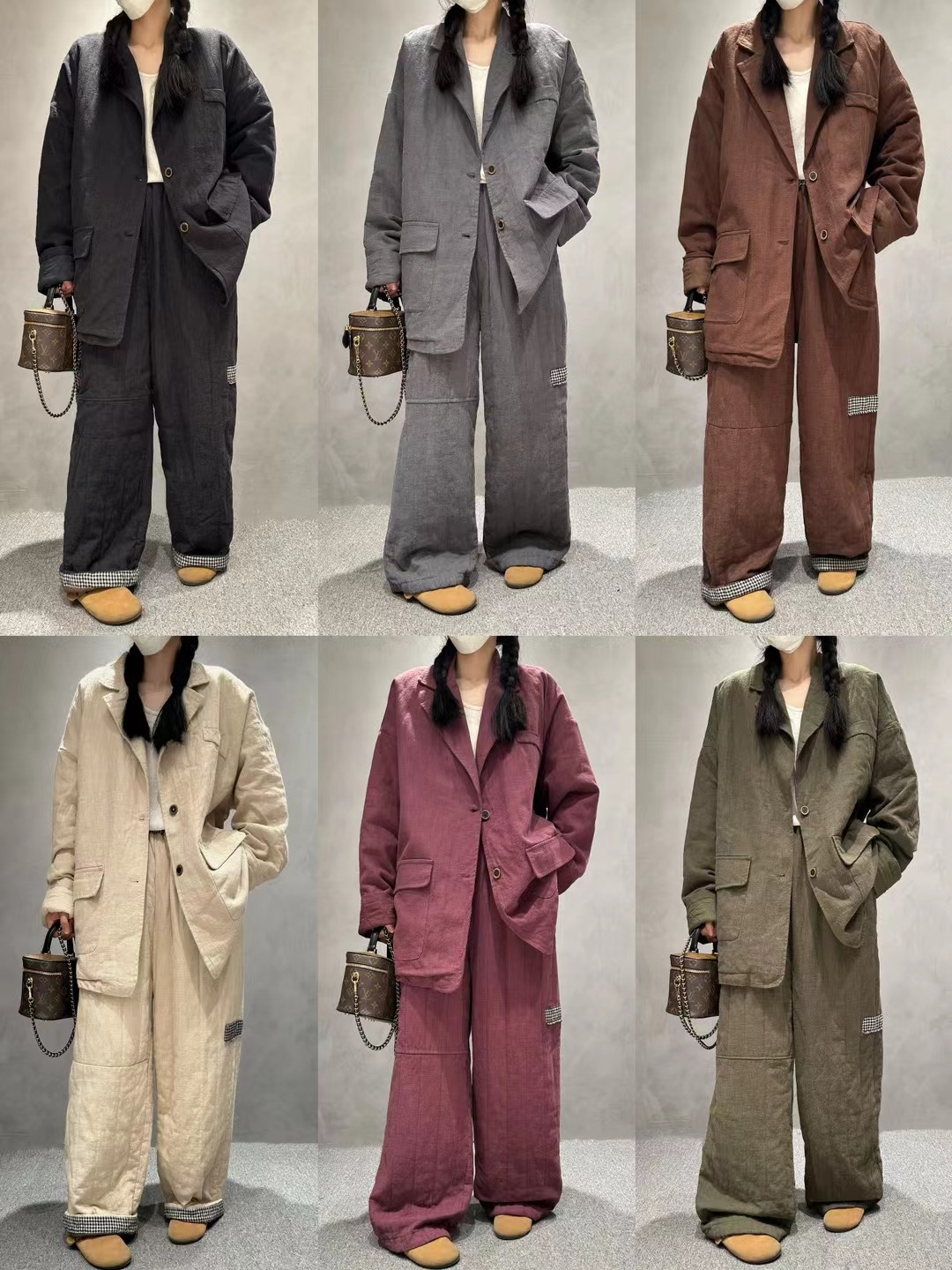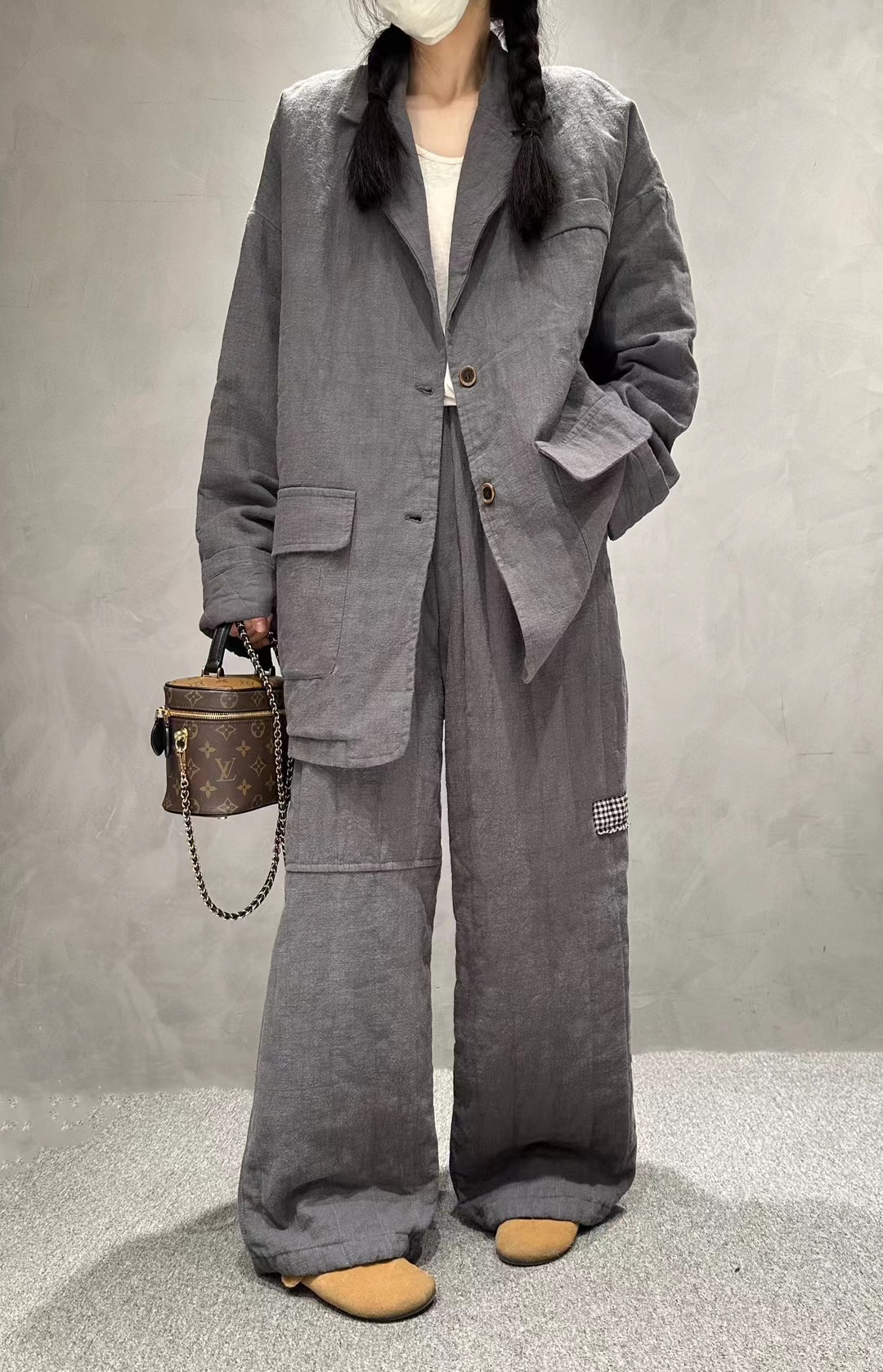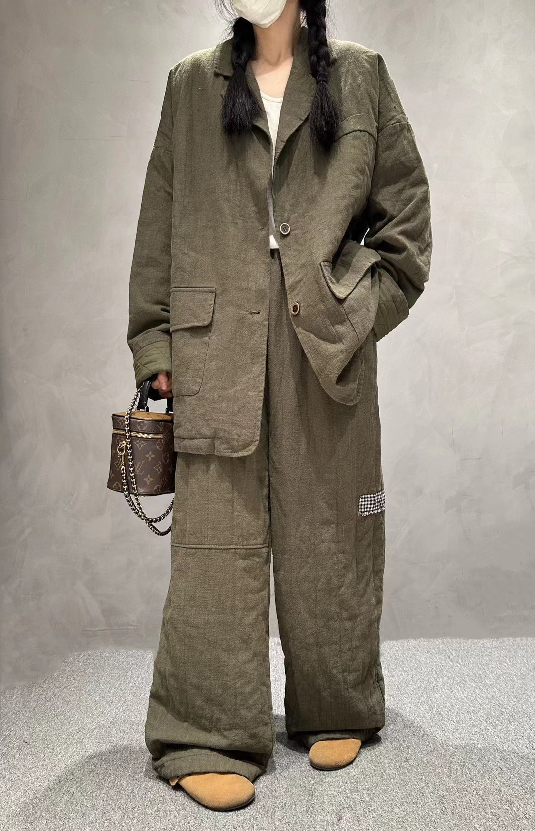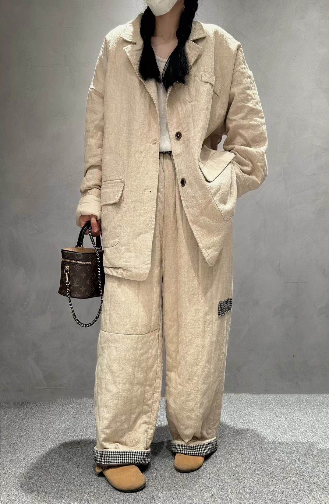 Cz2024夏の新しい女性式開襟カジュアルファッションスーツセット長袖ワイドパンツポケット亜麻