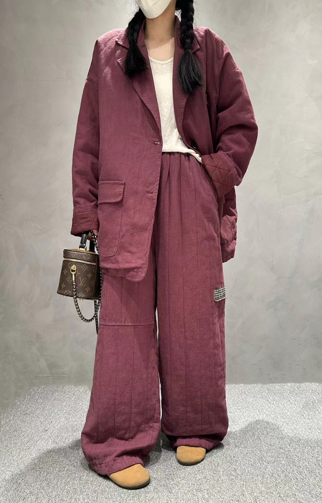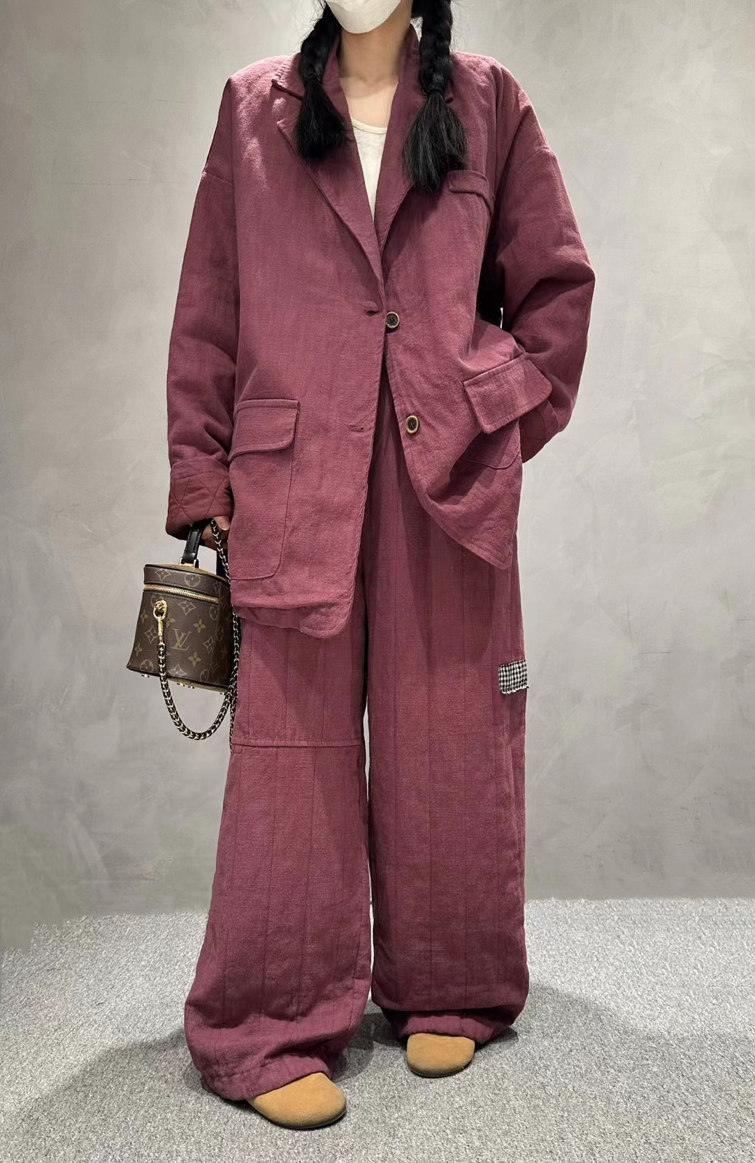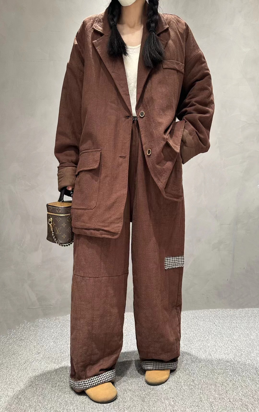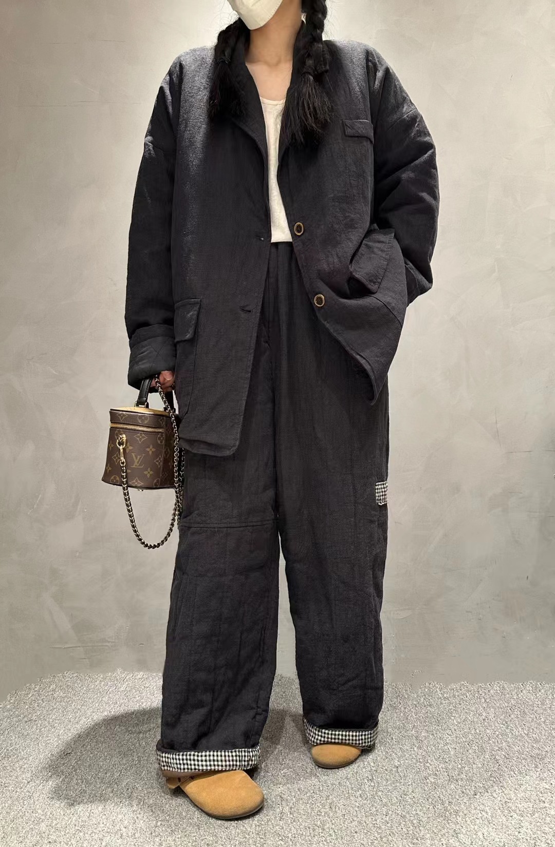 Cz2024夏の新しい女性式開襟カジュアルファッションスーツセット長袖ワイドパンツポケット亜麻
