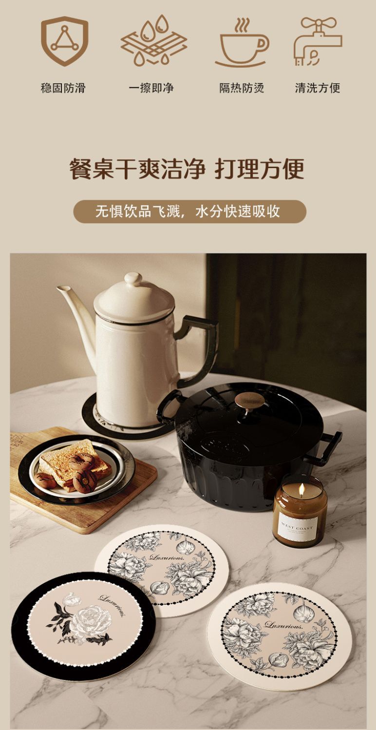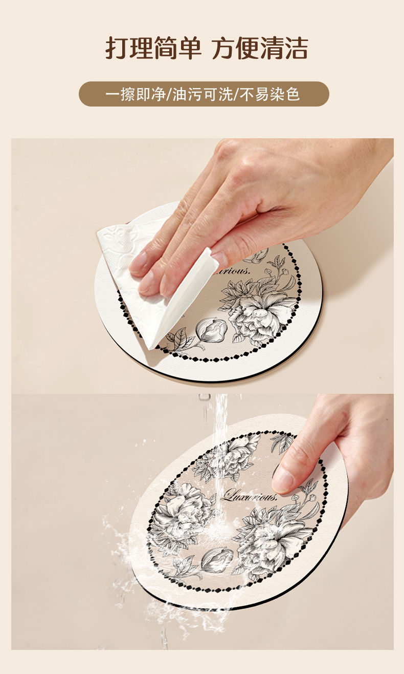 アメリカンライトラグジュアリースタイルのテーブル断熱マット、丸型の小さなプレースマット、洗濯不要、吸水速乾、ボウルマット、プレートマット、カップマット