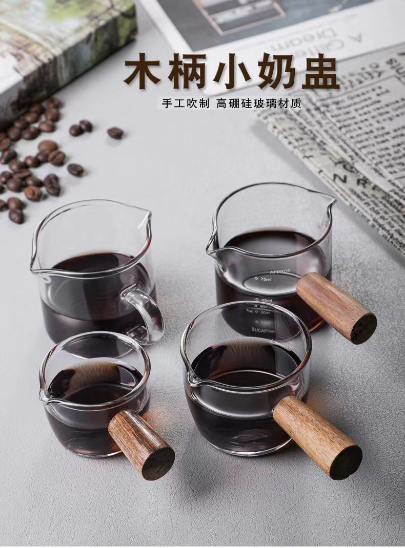 高硼硅玻璃侧木把手带刻度量杯 简约家用调料酱咖啡杯 迷你小奶罐
