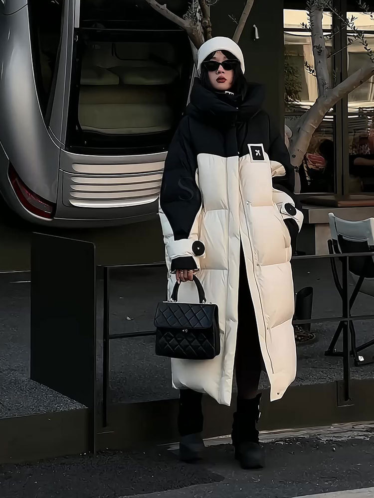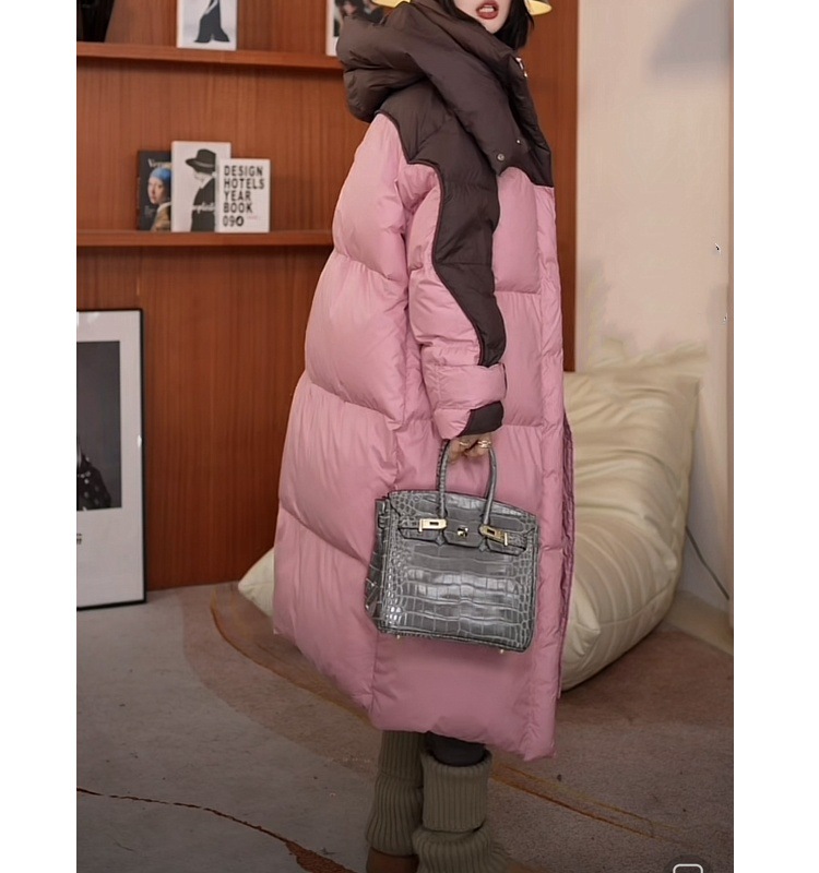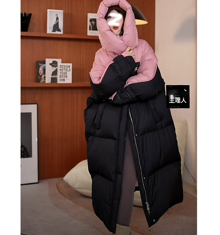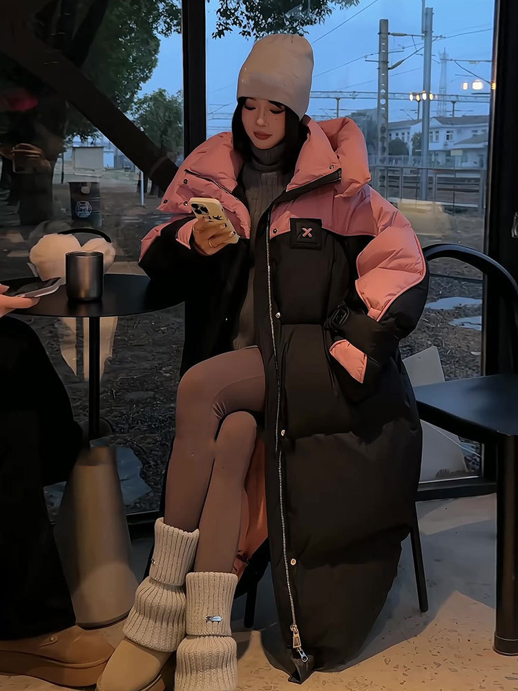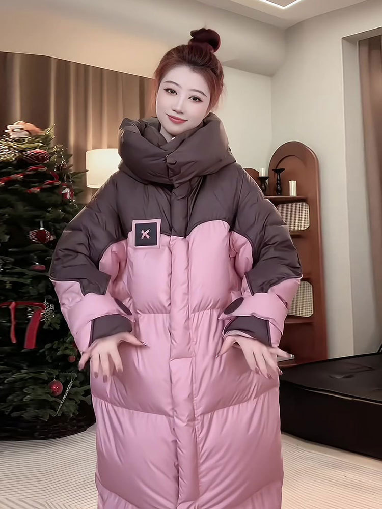 2025年冬の新型韓国版綿入れコートは帽子の中の長さまで厚くて暖かい綿服のゆったりとした色合わせコートです。