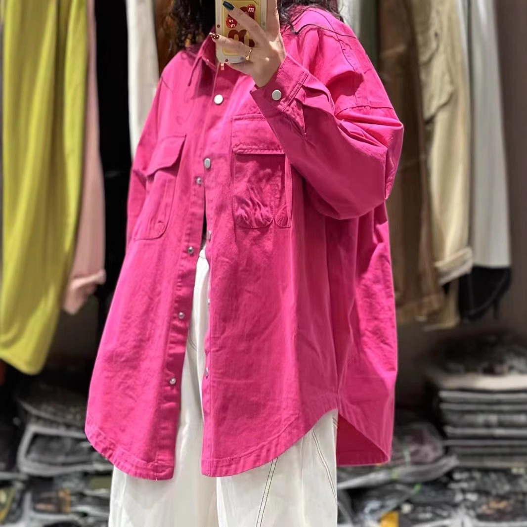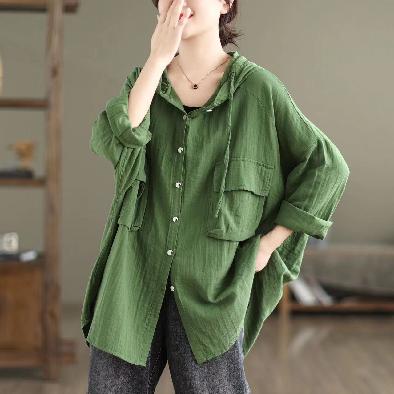 2025春の新型レトロ文芸カジュアルゆったり帽子付き純色大ポケットシャツ女性