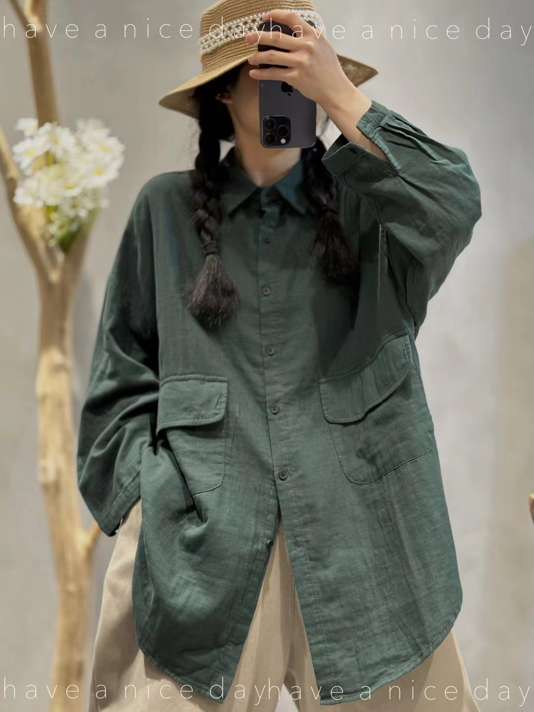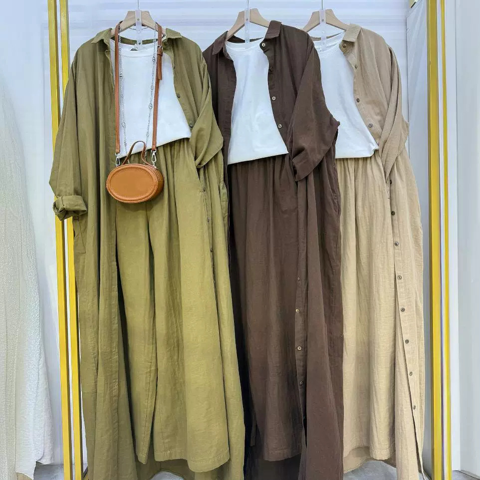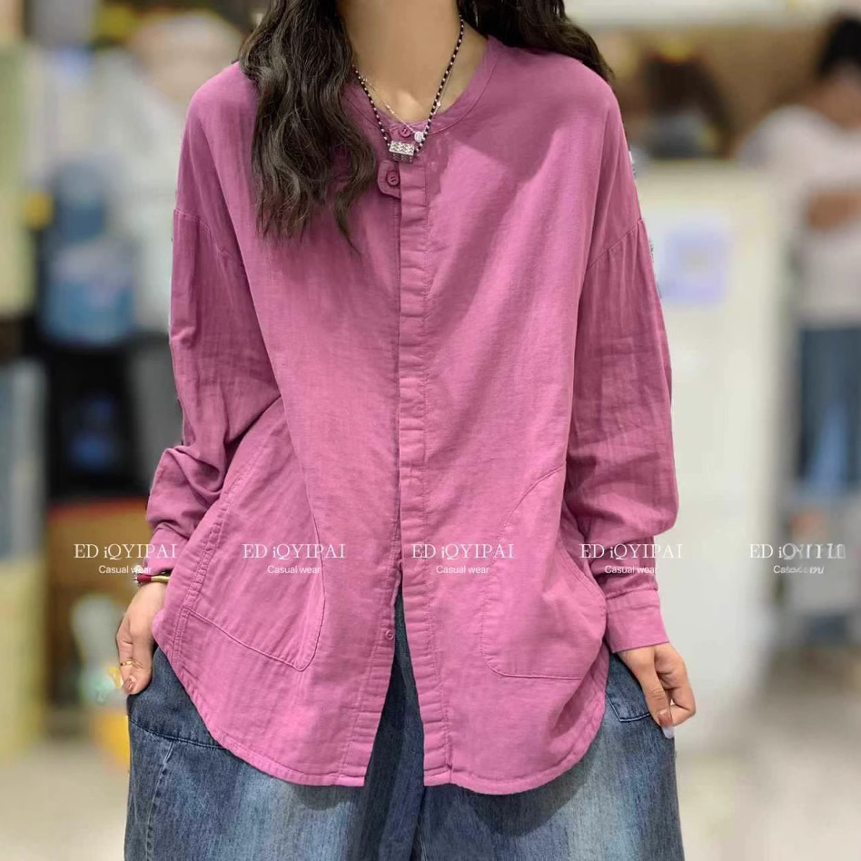 ed3719 文学レトロルーズビッグバージョン気質長袖シャツ新しい無地二重糸綿とリネンのミドル丈トップ