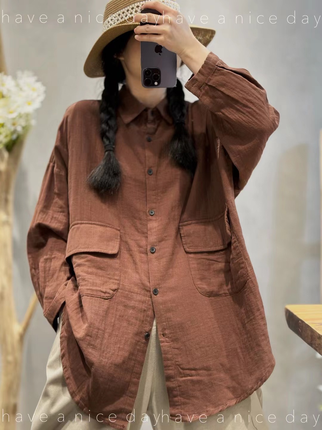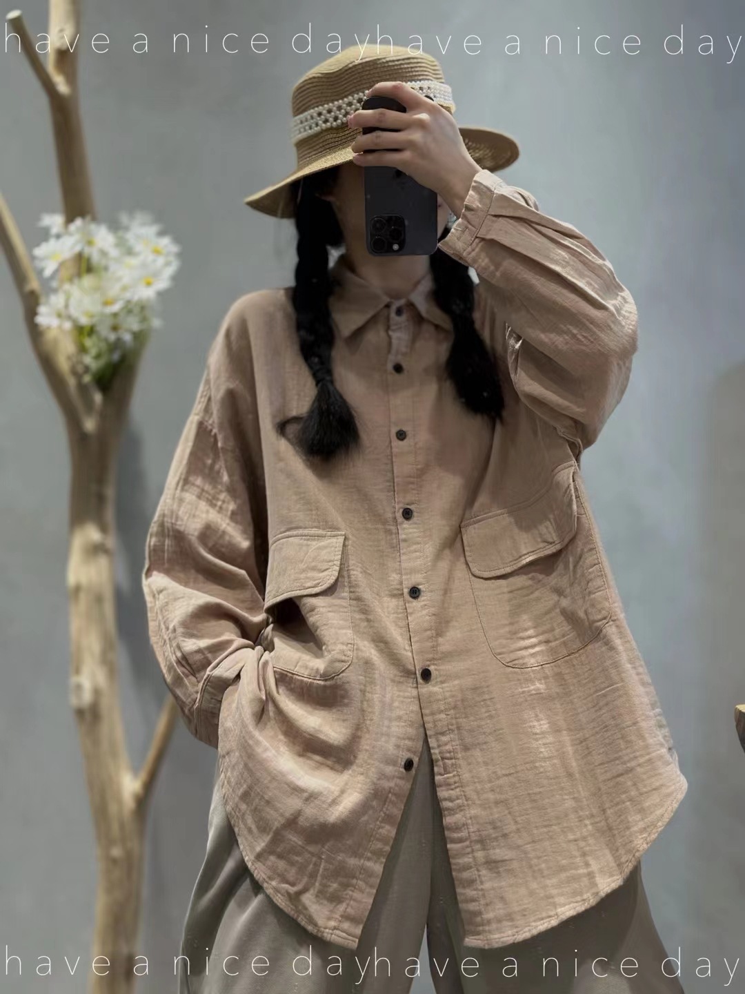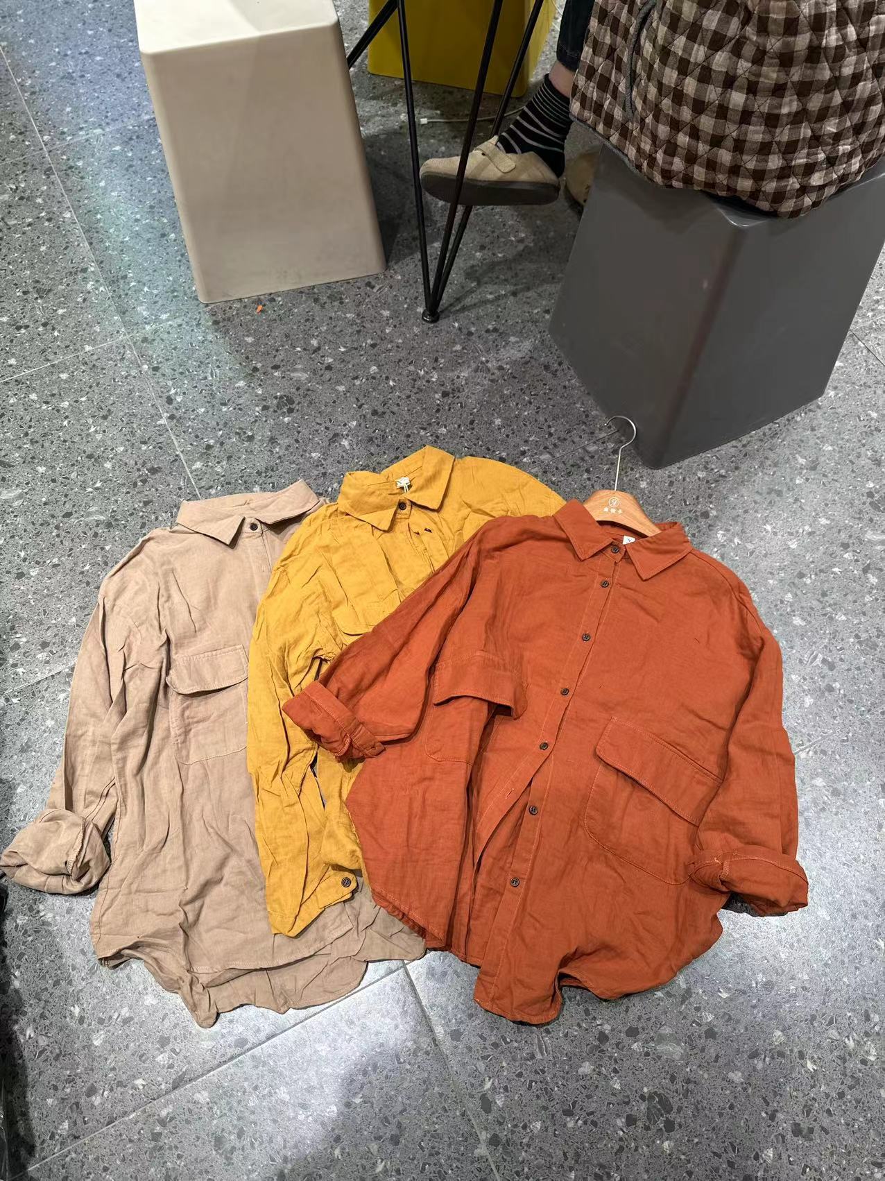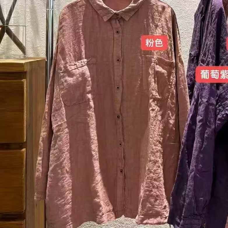 砂洗炒色复古做旧亚麻衬衫女长袖宽松百搭休闲中长款冬季新款5371