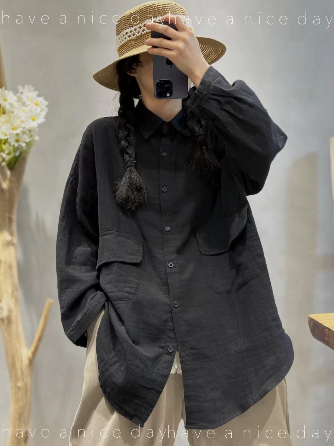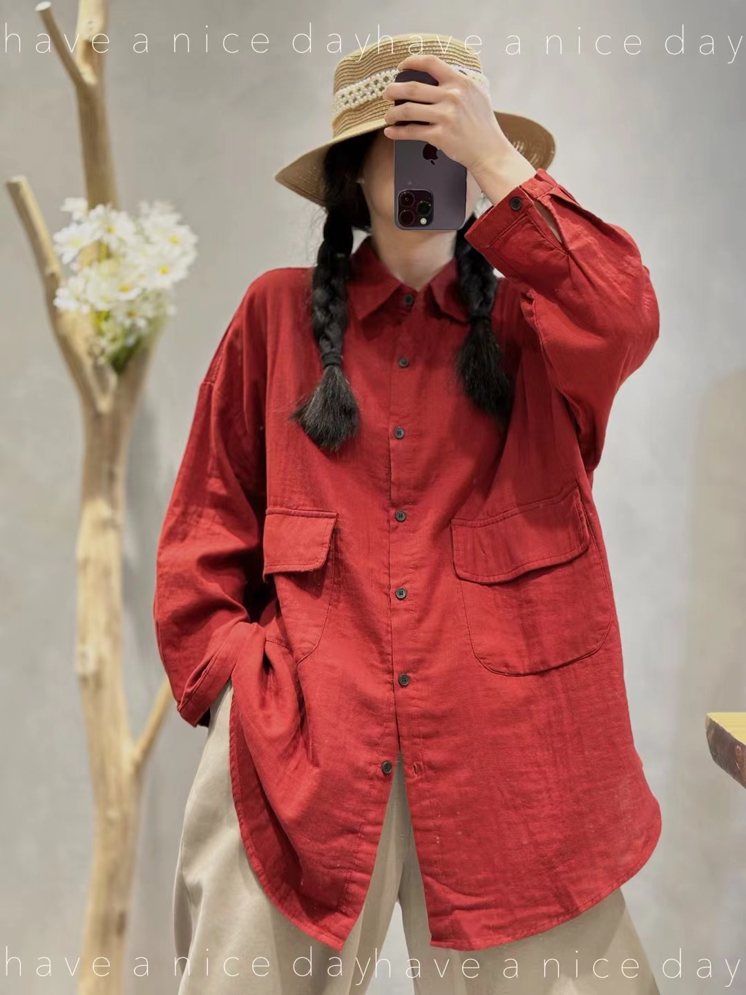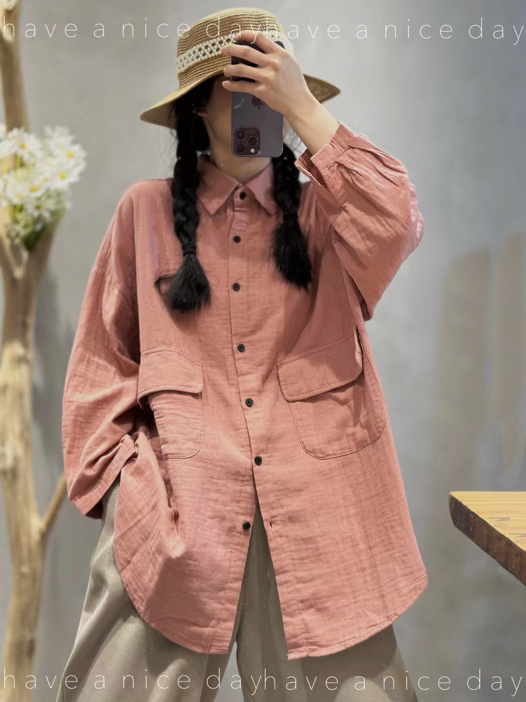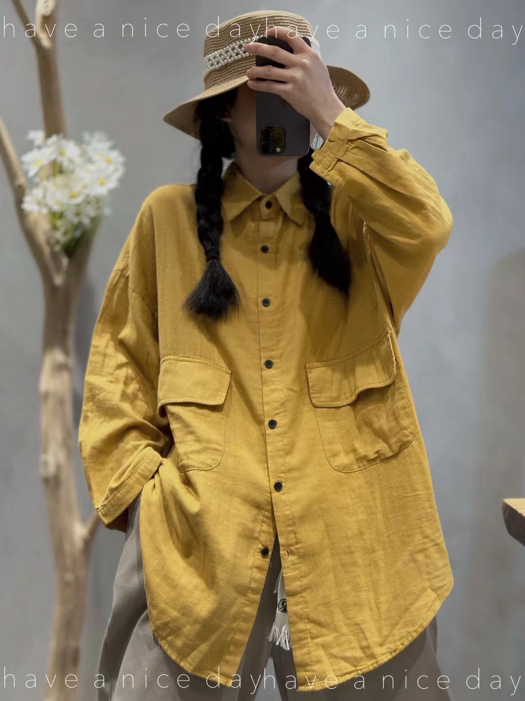 砂洗炒色复古做旧亚麻衬衫女长袖宽松百搭休闲中长款冬季新款5371