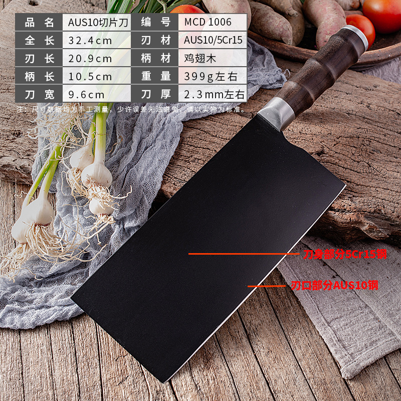 複合鋼スライスナイフ AUS-10 鋼鍛造シャープ中華キッチン専用業務用野菜・肉カット黒面ナイフ