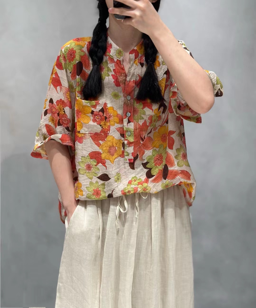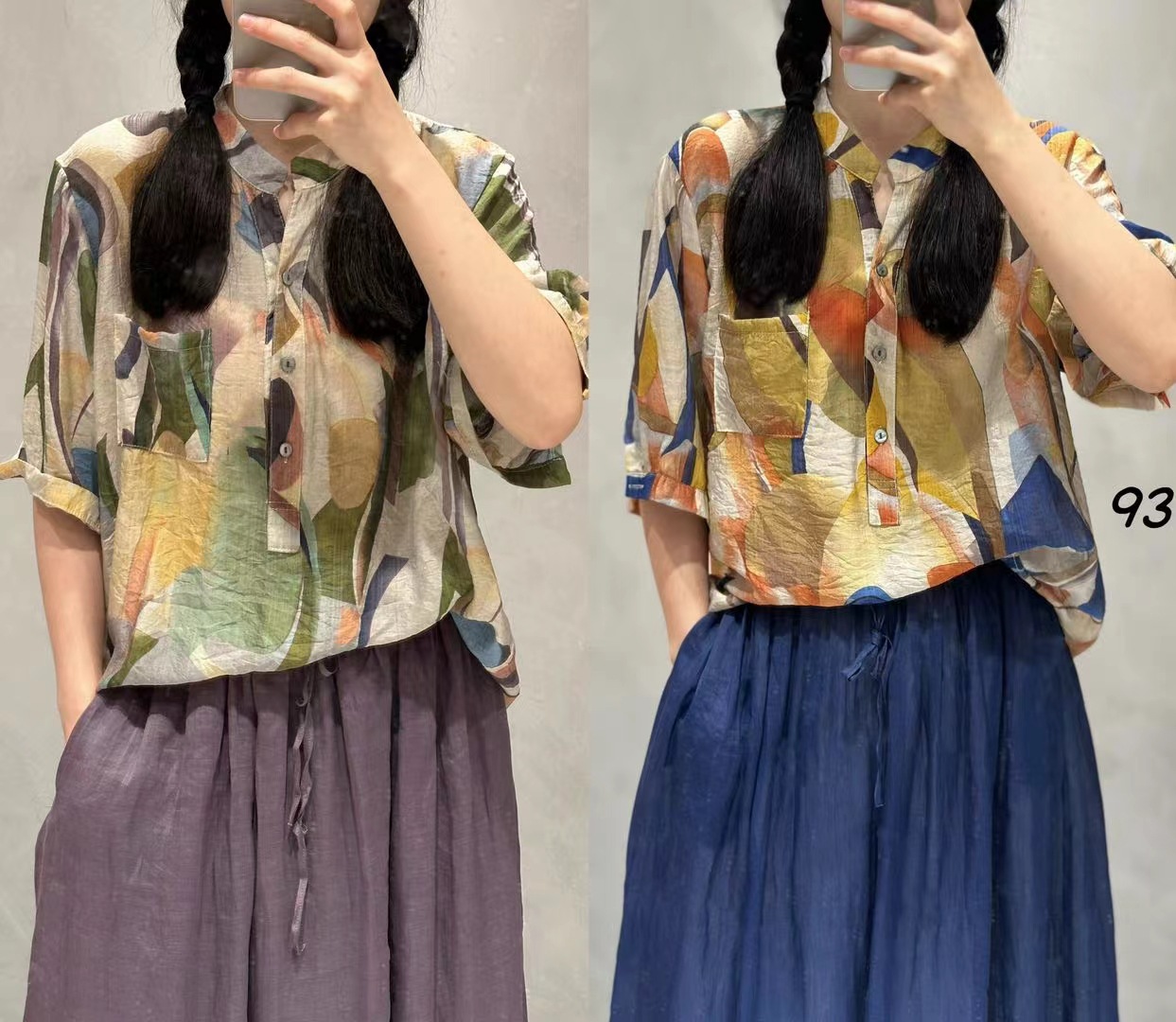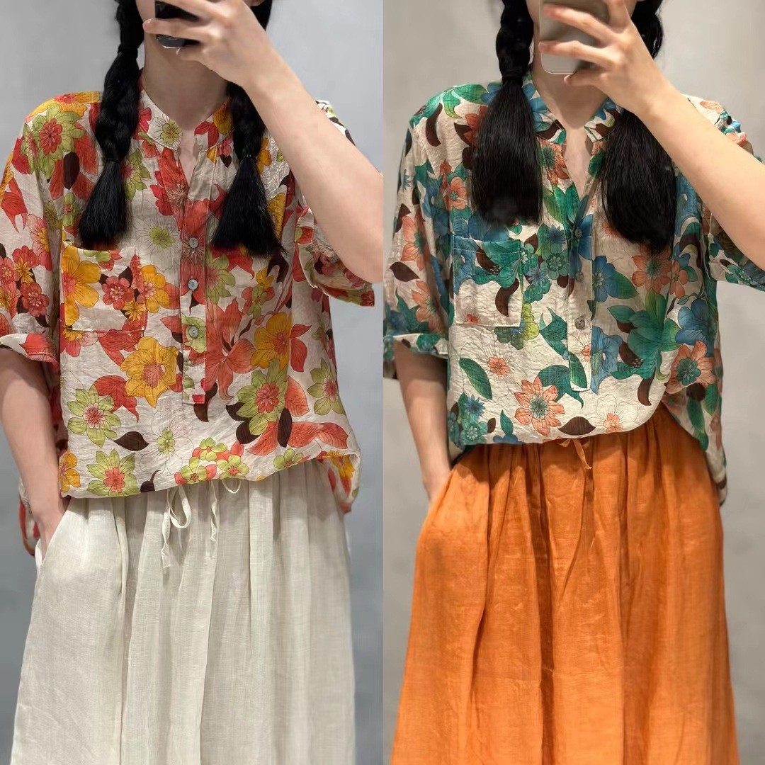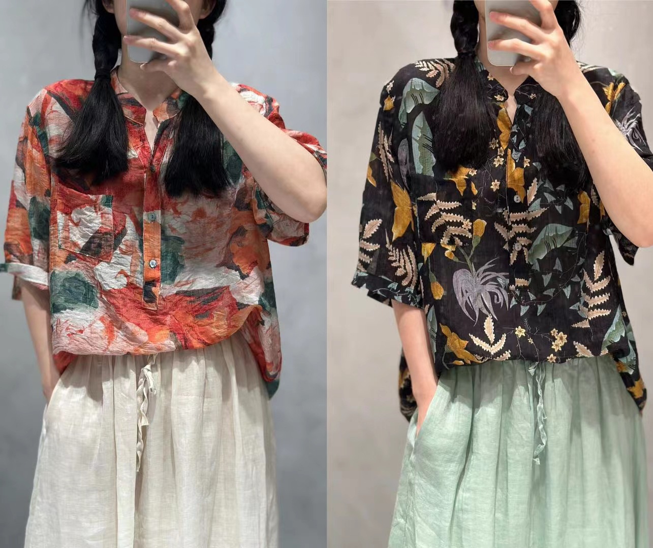 Cz9378レトロなプリントのゆったりとした薄いラミー麻の中袖のシャツ