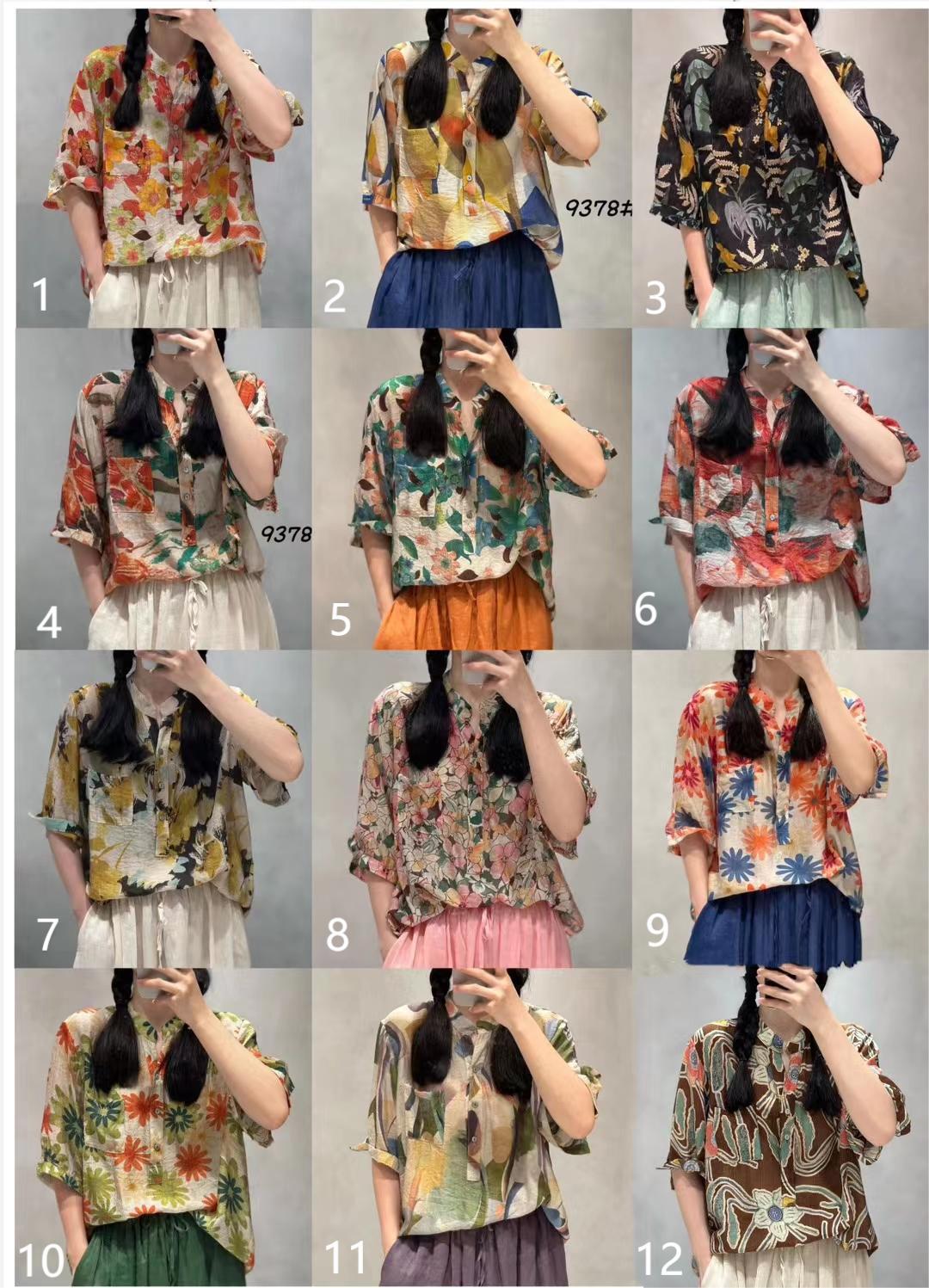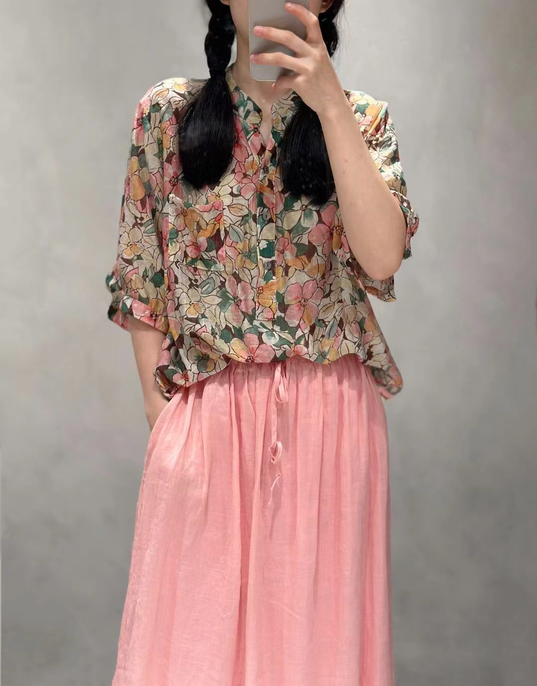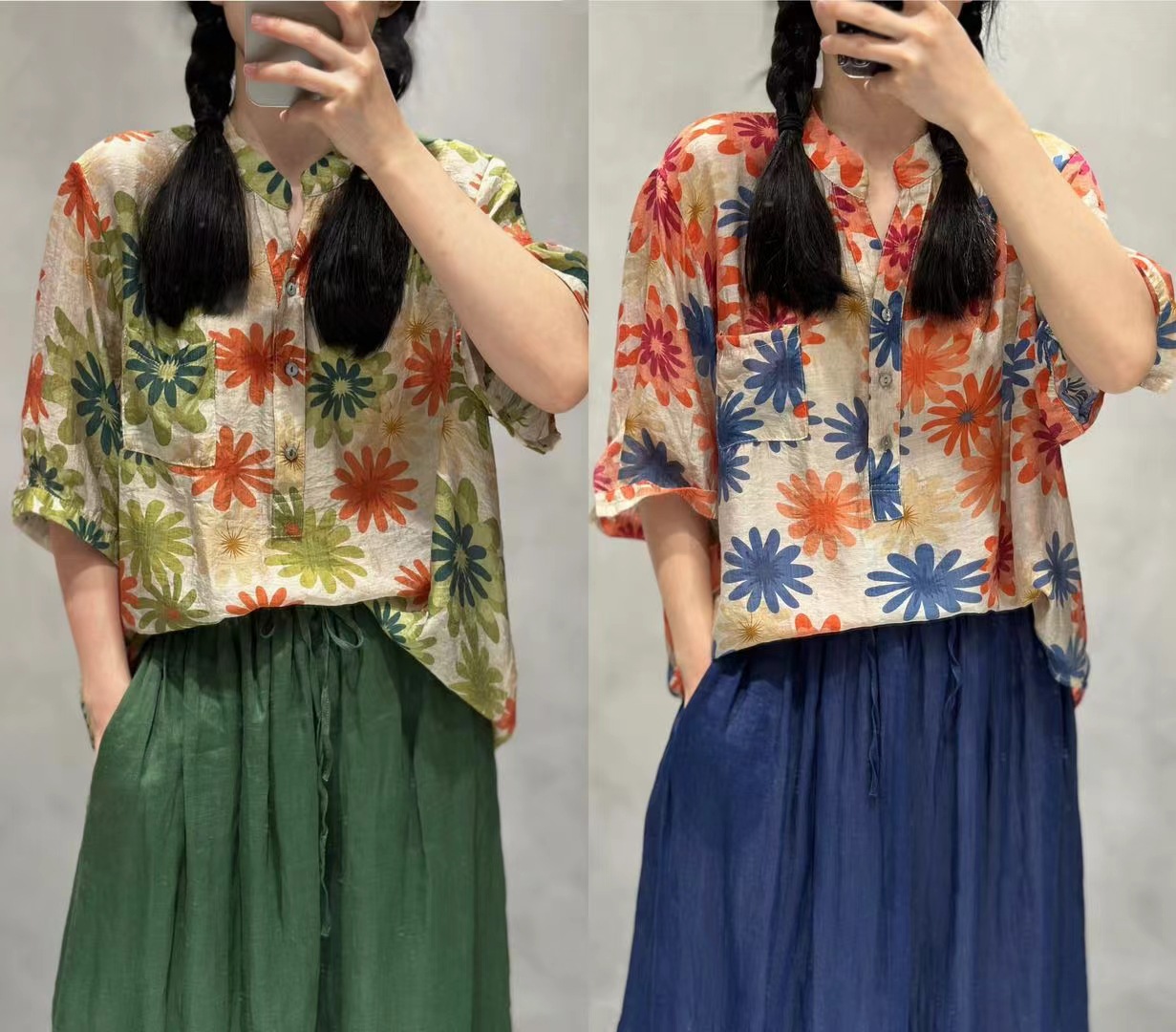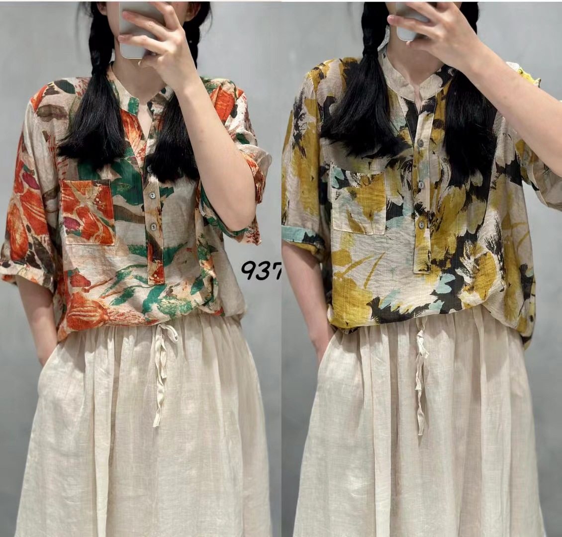 Cz9378レトロなプリントのゆったりとした薄いラミー麻の中袖のシャツ