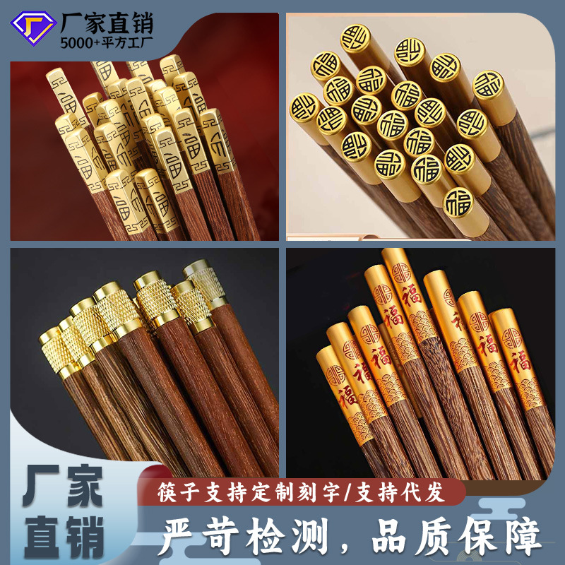 円福鶏翅木箸家庭用無漆無蝋実木防かび紅檀木円頂福金属頭木箸