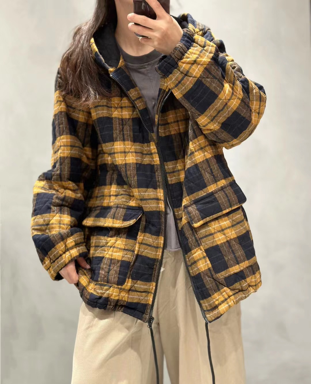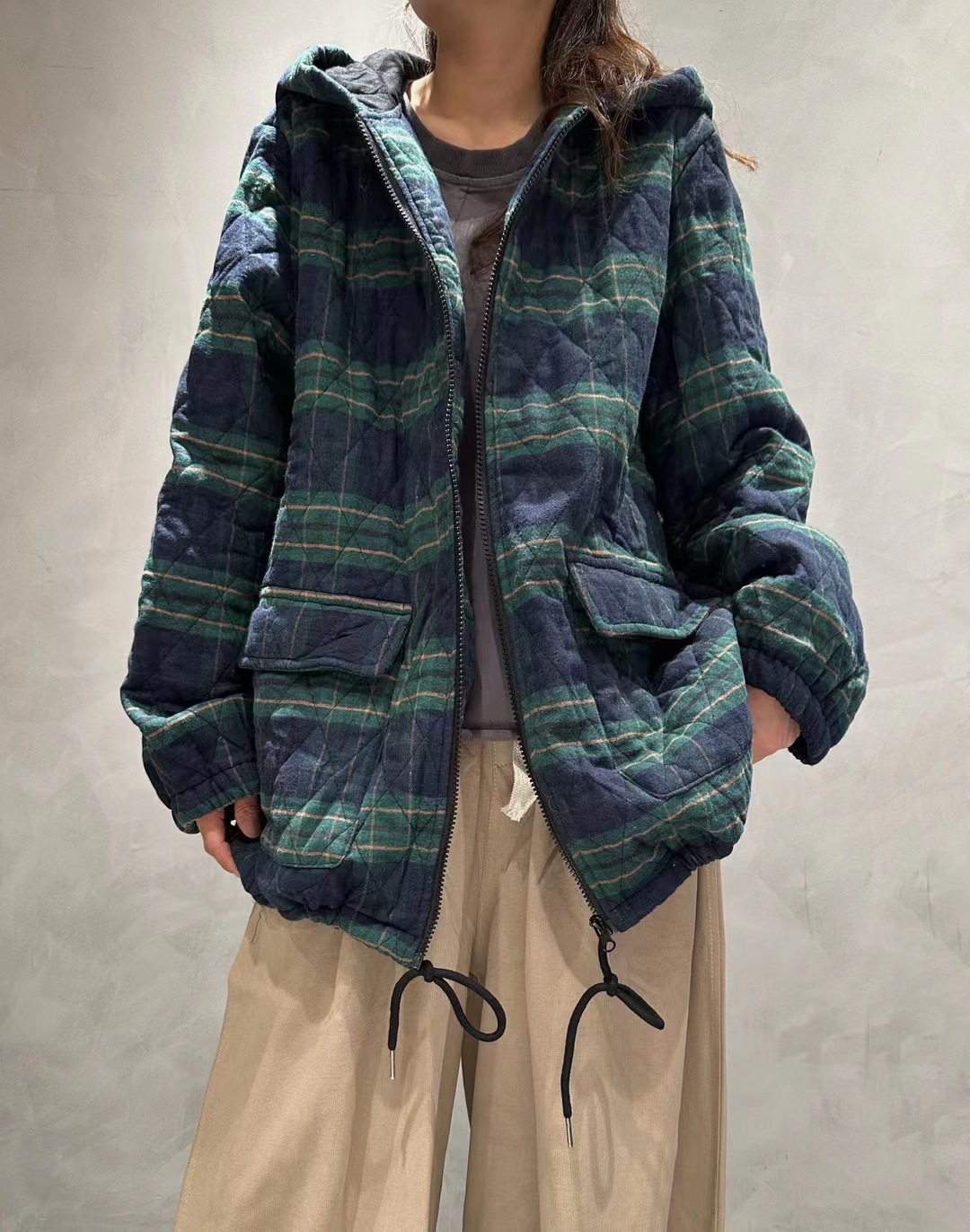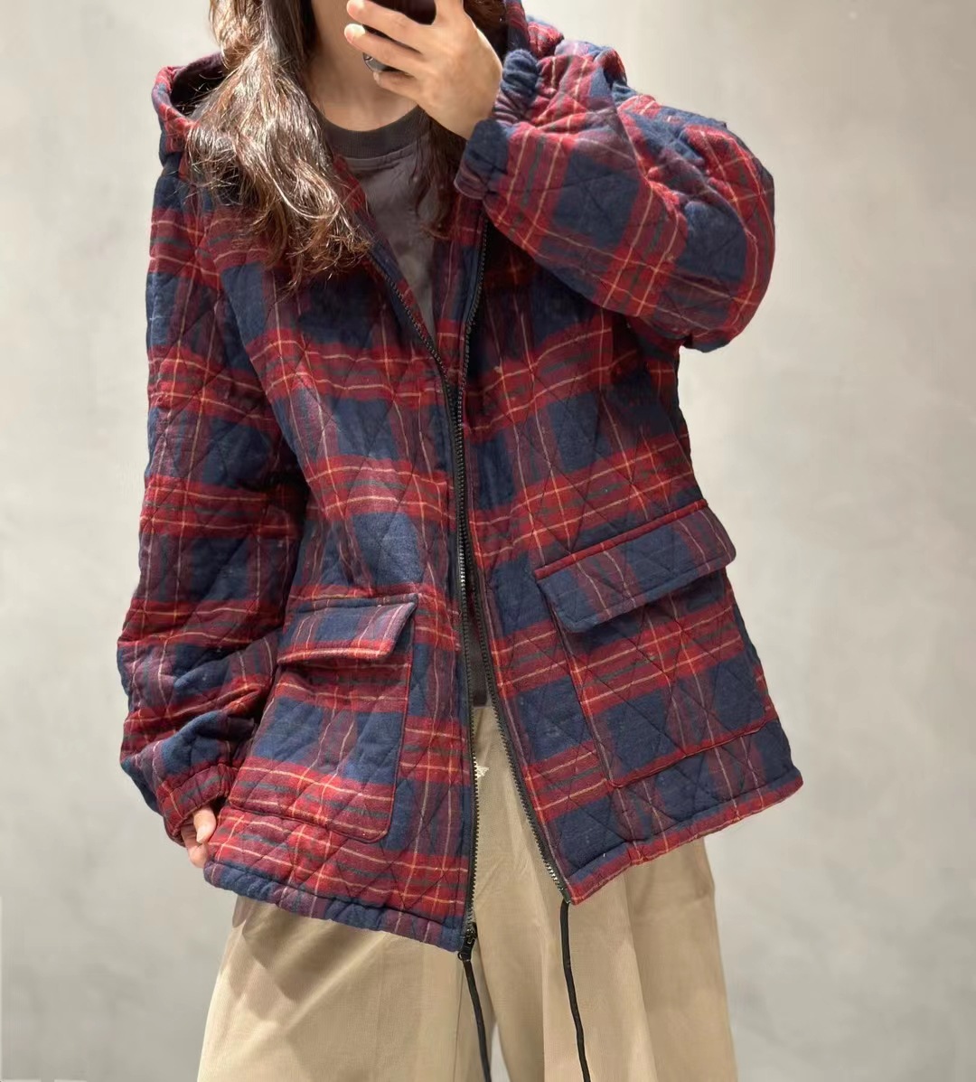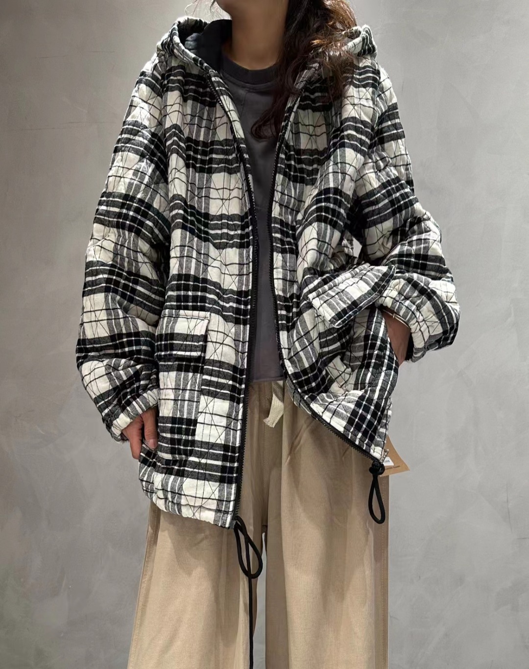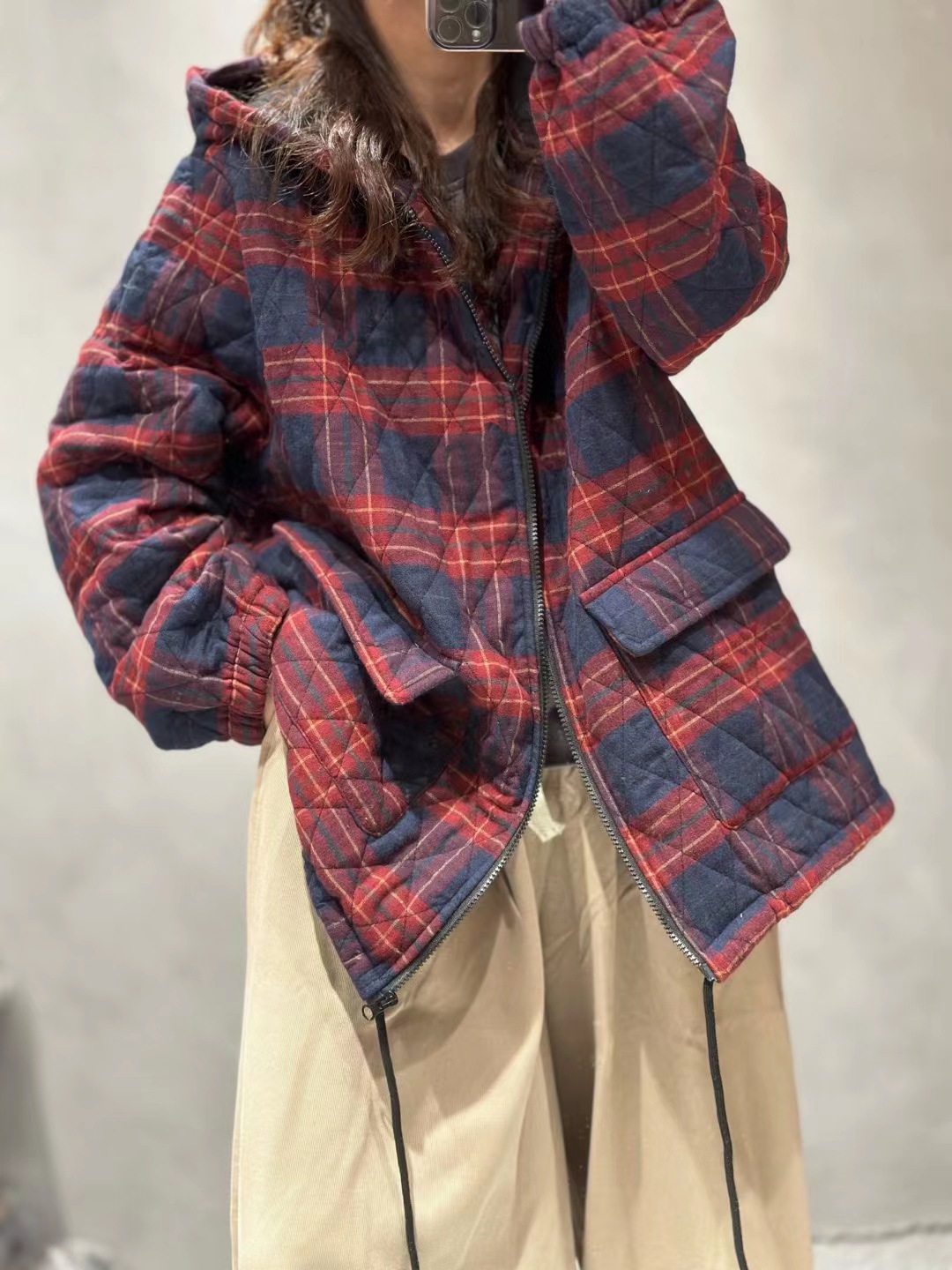 Cz9775帽子付き格子綿入れの新商品の実写格子が厚くて、保温がゆったりしています。