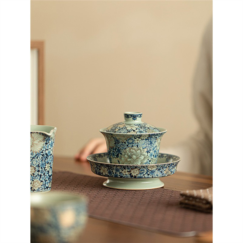 汝窯繁花三才蓋碗陶磁器家庭用高足中国式レトロ乾燥泡台敬茶碗工夫茶器卸売り