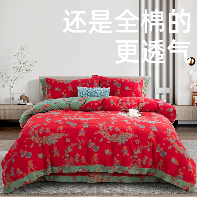 純綿4点セット 純綿二重ガーゼ 中華風百福柄掛け布団 綿麻掛け布団カバー ベッドシーツ 結婚祝いセット 百福柄