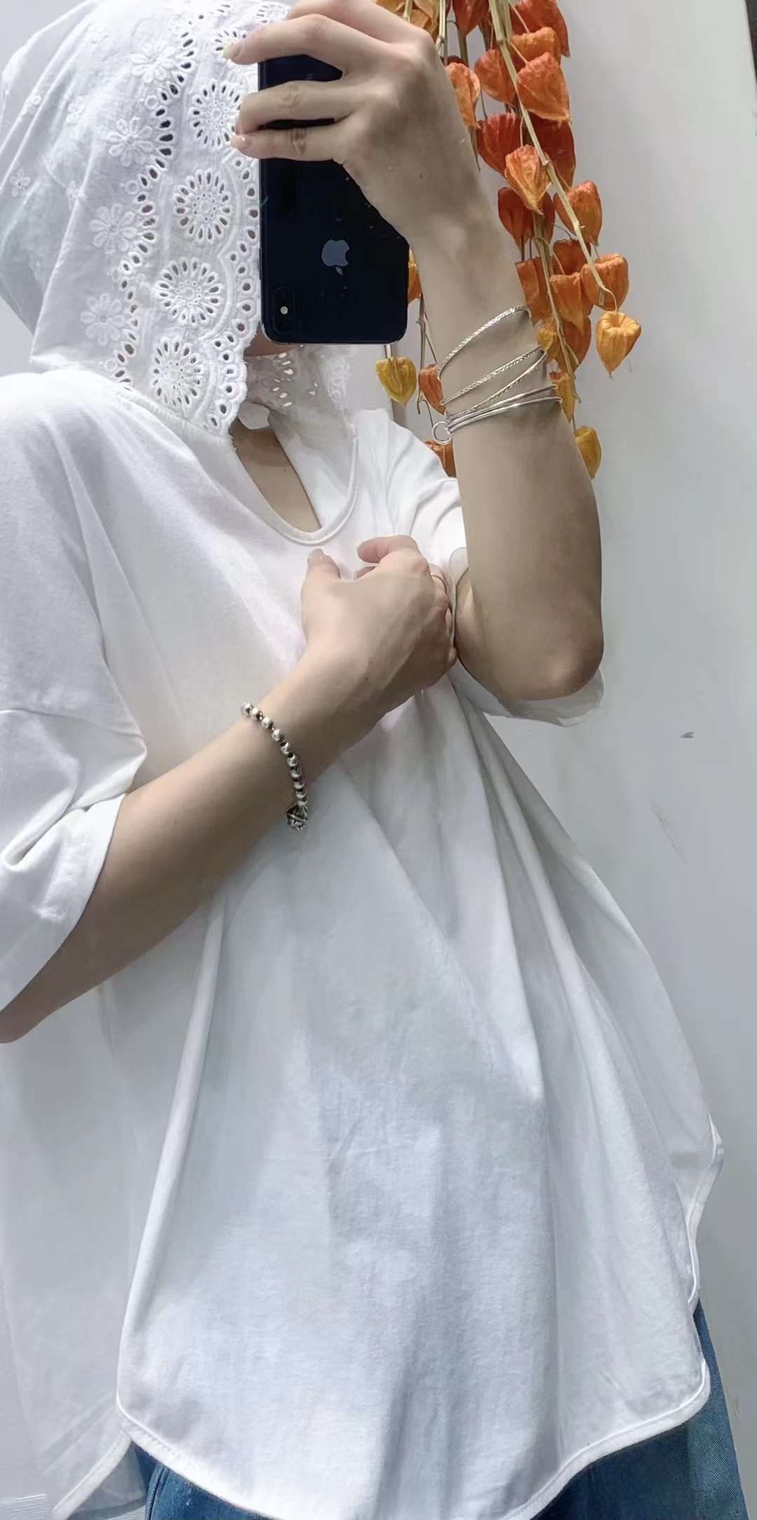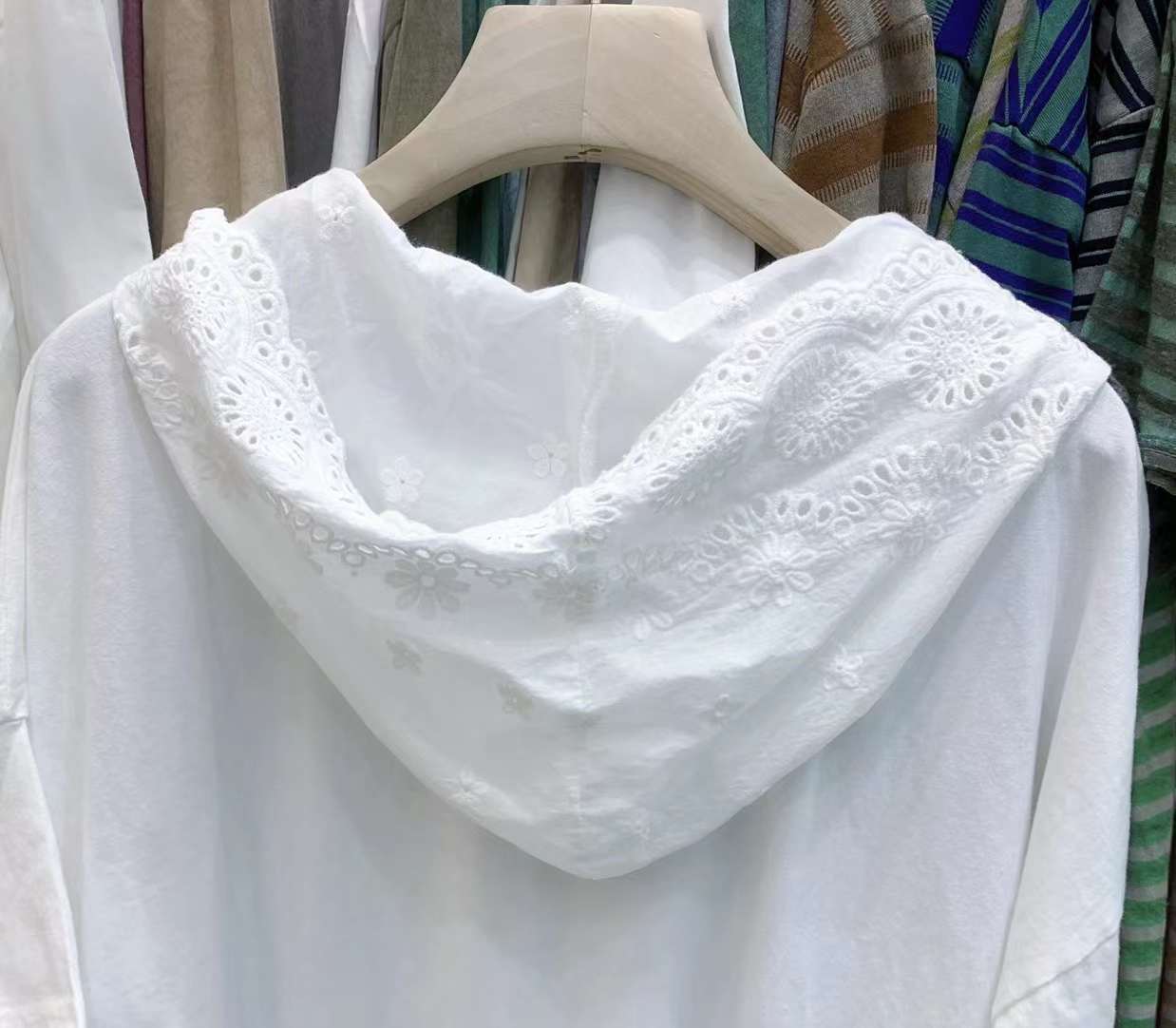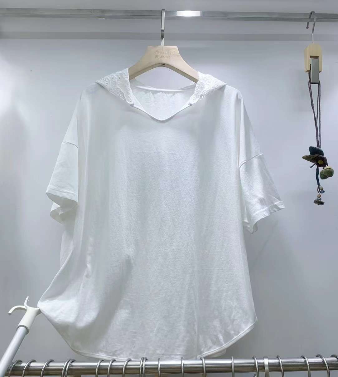 Fm 00393純綿の帽子付きのゆったりした大バージョンの半袖刺繍の帽子のシャツ2024夏の文芸の純色のtシャツの女性