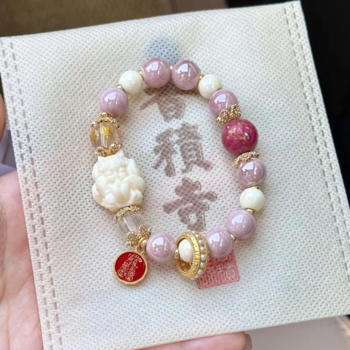 香積寺の新型粉磁器九尾狐瑠璃金箔輸送手串桃花古法ピンクカップルブレスレットプレゼント