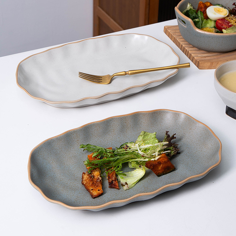 創造的な花柄の蒸し魚皿、家庭用レトロレストラン業務用食器、高級感のある食器、不規則な形状の陶磁器食器